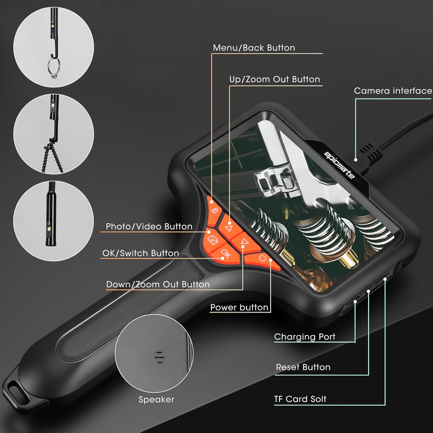 Triple Lens Endoscope with 5″ Haandhelld Screen: Equipped with a 1080P HD triple-lens borescope, this borescope inspection camera provides wide-angle forward and side views, ensuring no blind spots when checking pipes, automotive engines, drains, or wall cavities. The 5″ IPS screen delivers clear real-time images, reducing guesswork and improving efficiency for both professionals and DIY users.