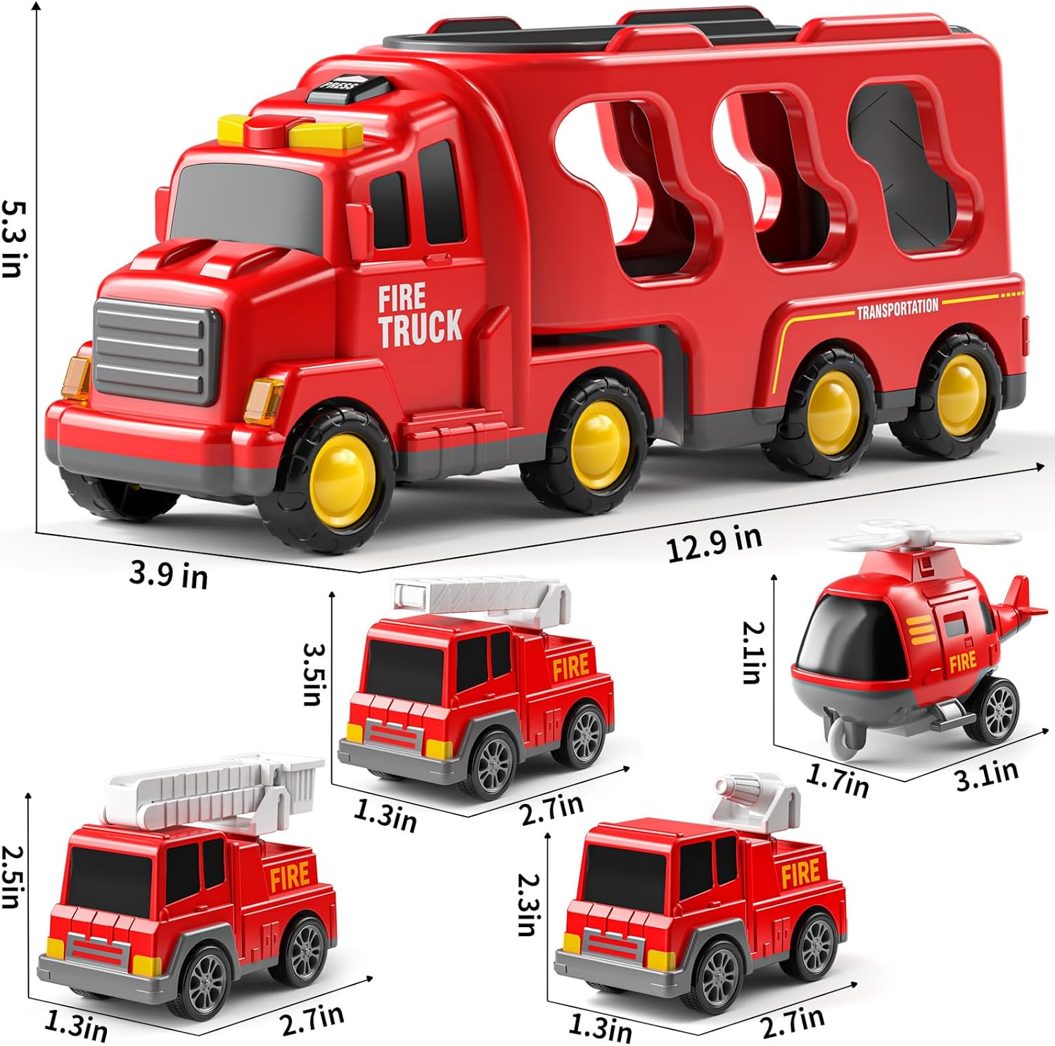 5 in 1 Truck Toys: Kids fire carrier truck toy includes a larger transport truck(12.9*3.9*5.3in) and 4 small car including sprinkler, ladders car, fire car and helicopters. It is recommended and suitable for kids aged 3 and above to create much happy time