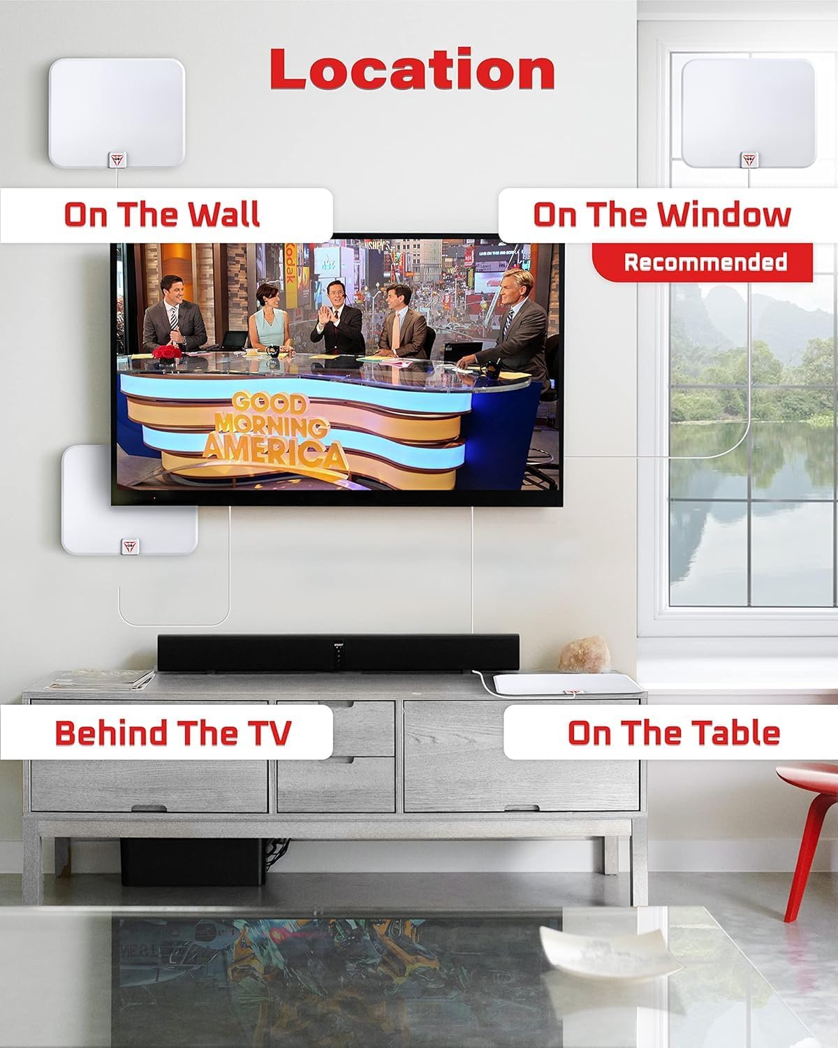 ✔️ UP TO 1000 MILES RANGE: Indoor HDTV antennas have a reach of up to 600 miles, and our TV antennas are equipped with 26.5 feet of cable that can be moved almost anywhere in your home, and the digital antenna is constantly scanning for new broadcast channels. Hang the indoor antenna from a window or wall, or place it in a location where you can better receive the signal in your home. Note: Always remember to rescan for channels after moving the antenna.