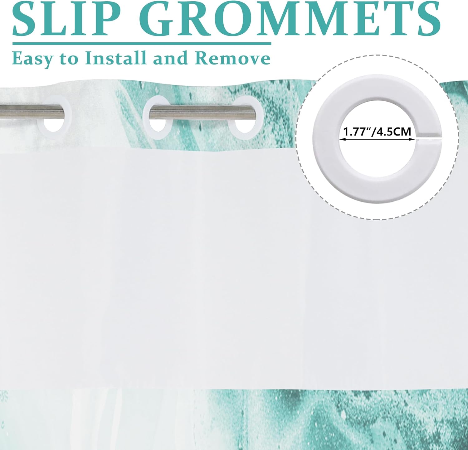 【NO HOOK SHOWER CURTAIN】 The teal marble shower curtain with a liner that just snaps on and off. This makes it incredibly easy to just wash the liner if needed. The fabric is light and airy so that light comes in on top it gives you a breezy feeling and looks great in your bathroom.