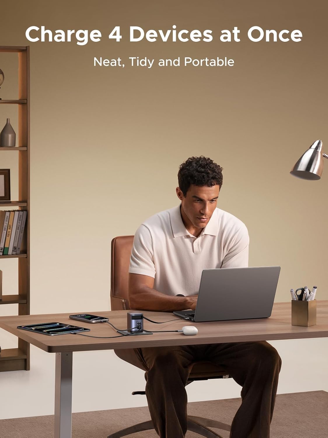 Simultaneous 4-Device Charging with Smart Power Allocation: Equipped with 2× USB-C + 1× USB-A ports. Intelligently distributes power across all connected devices without overheating.