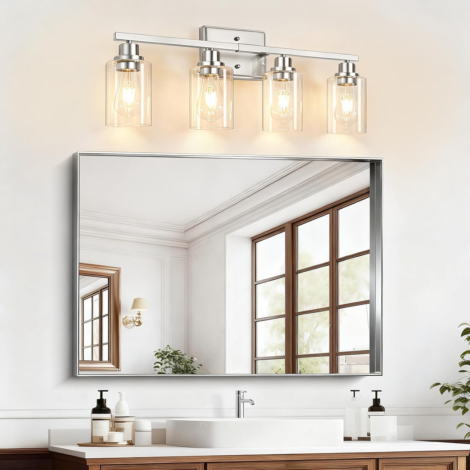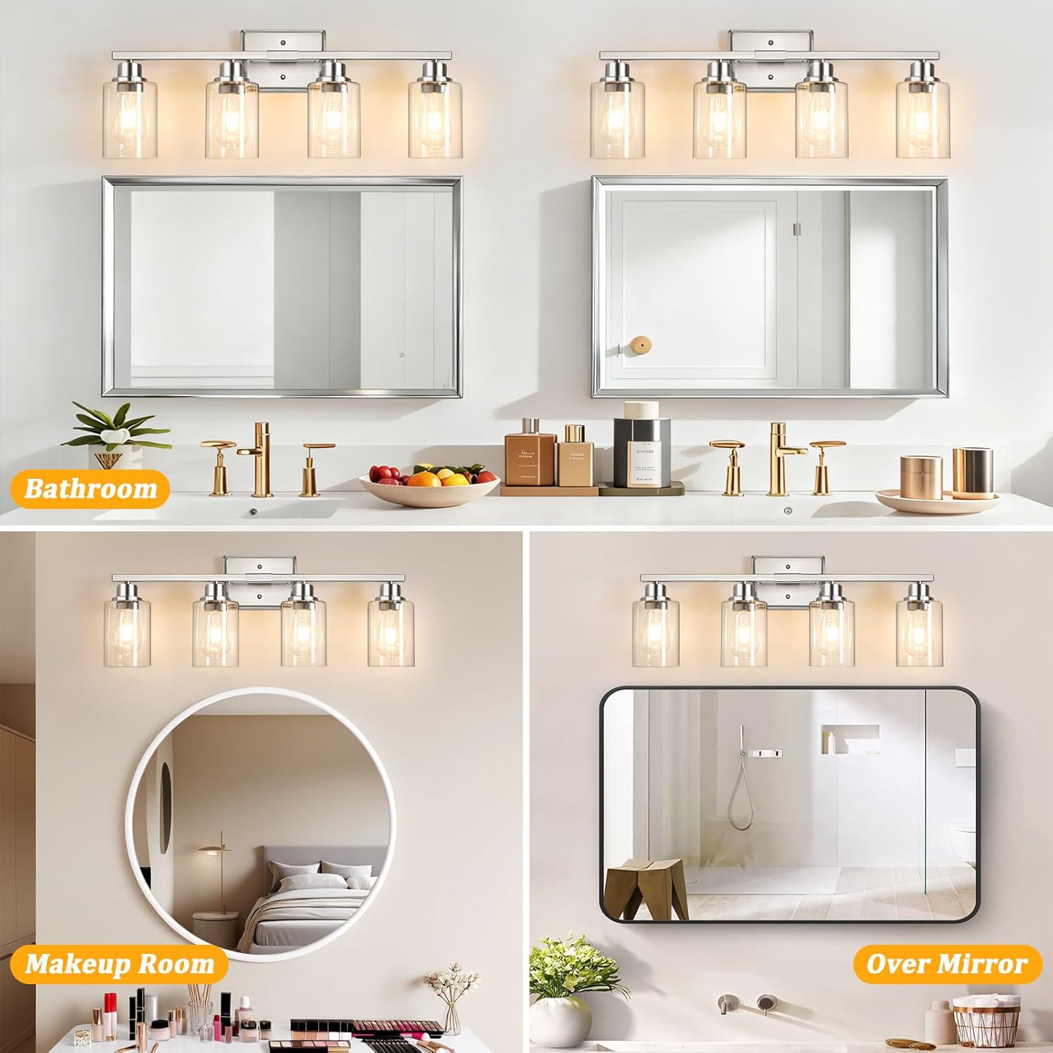 Elegant Brushed Nickel Design: 4-Light Bathroom lighting fixture is made of sturdy metal in a brushed nickel finish, complemented by sleek clear glass shades. It is suitable for various decoration styles, making it the perfect choice to enhance your home lighting.