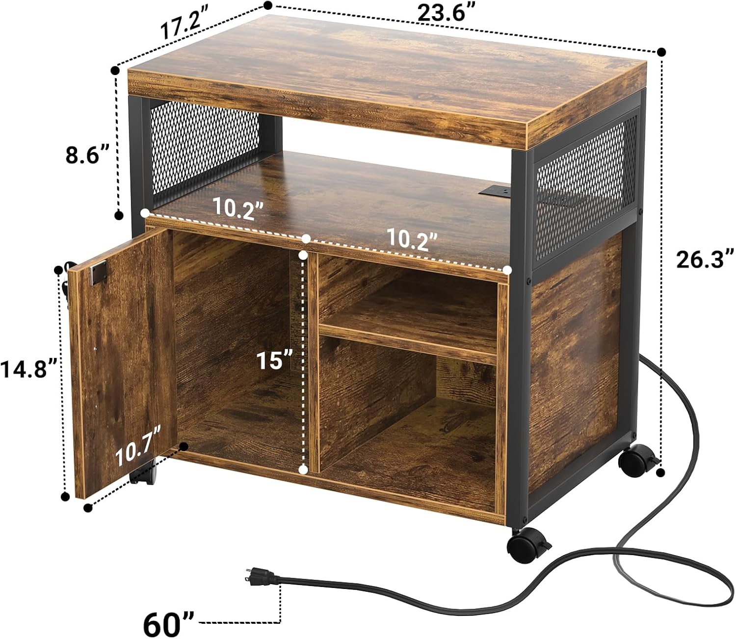 Unikito Lateral File Cabinet, Locking Office Filing Cabinets with Socket and USB Charging Port, Modern Rolling Printer Stand with Storage for A4, Letter Size and File Folders, Rustic Brown