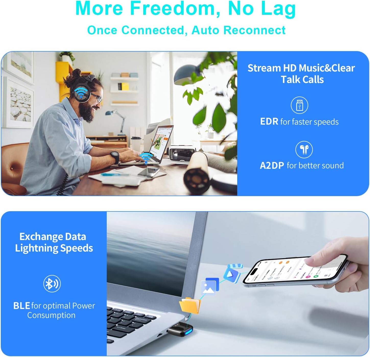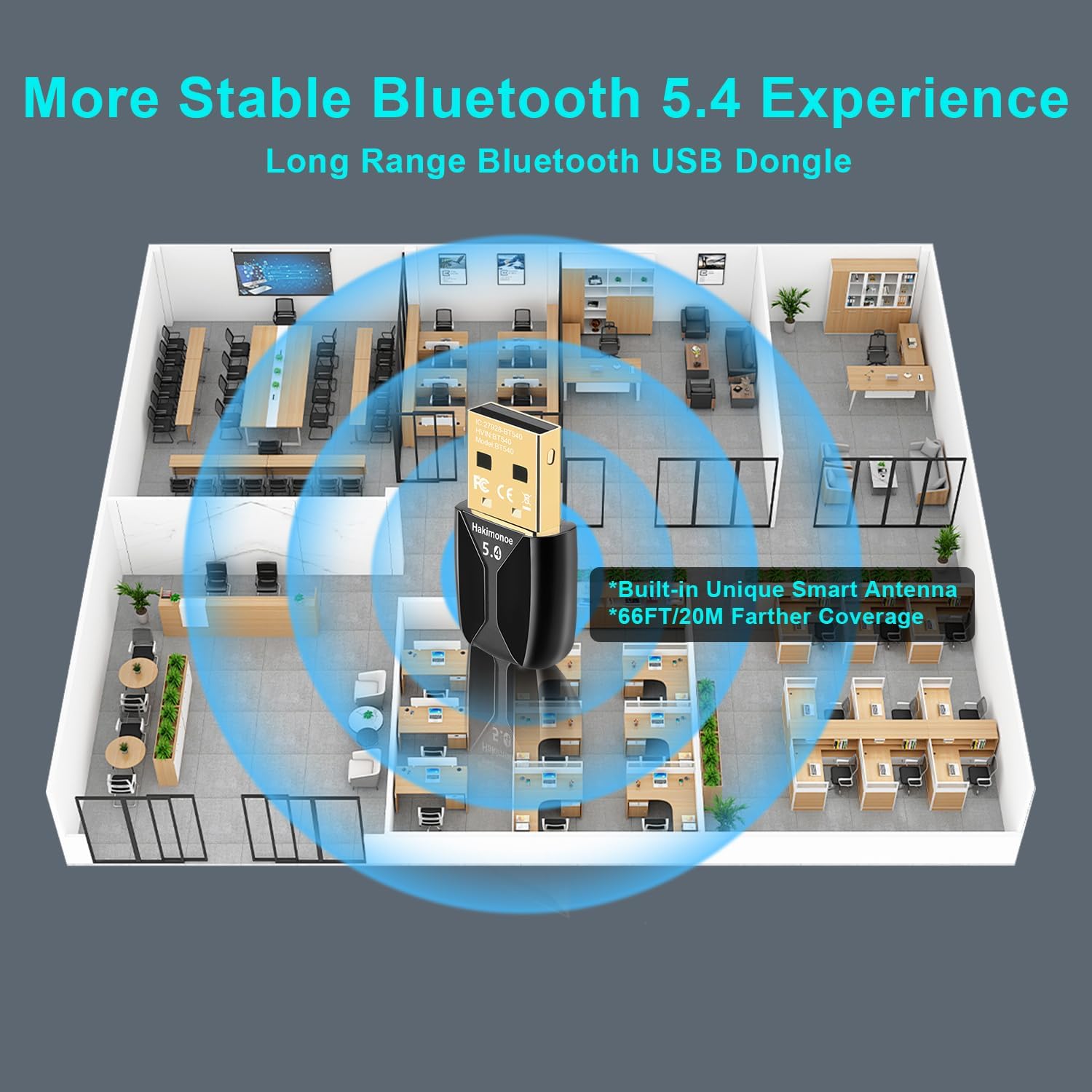 Faster Speed, Farther Coverage – With the upgraded Bluetooth 5.4 technology and the unique built-in smart antenna, this USB Bluetooth PC adapter will get faster data transfer speeds of up to full 3 Mbps, which is double what old Bluetooth supports and extend range of transmission distance up to 66ft/20M that is four times compared to old Bluetooth in open space. Note: The operational range can be affected by walls, physical obstructions and wireless interference.