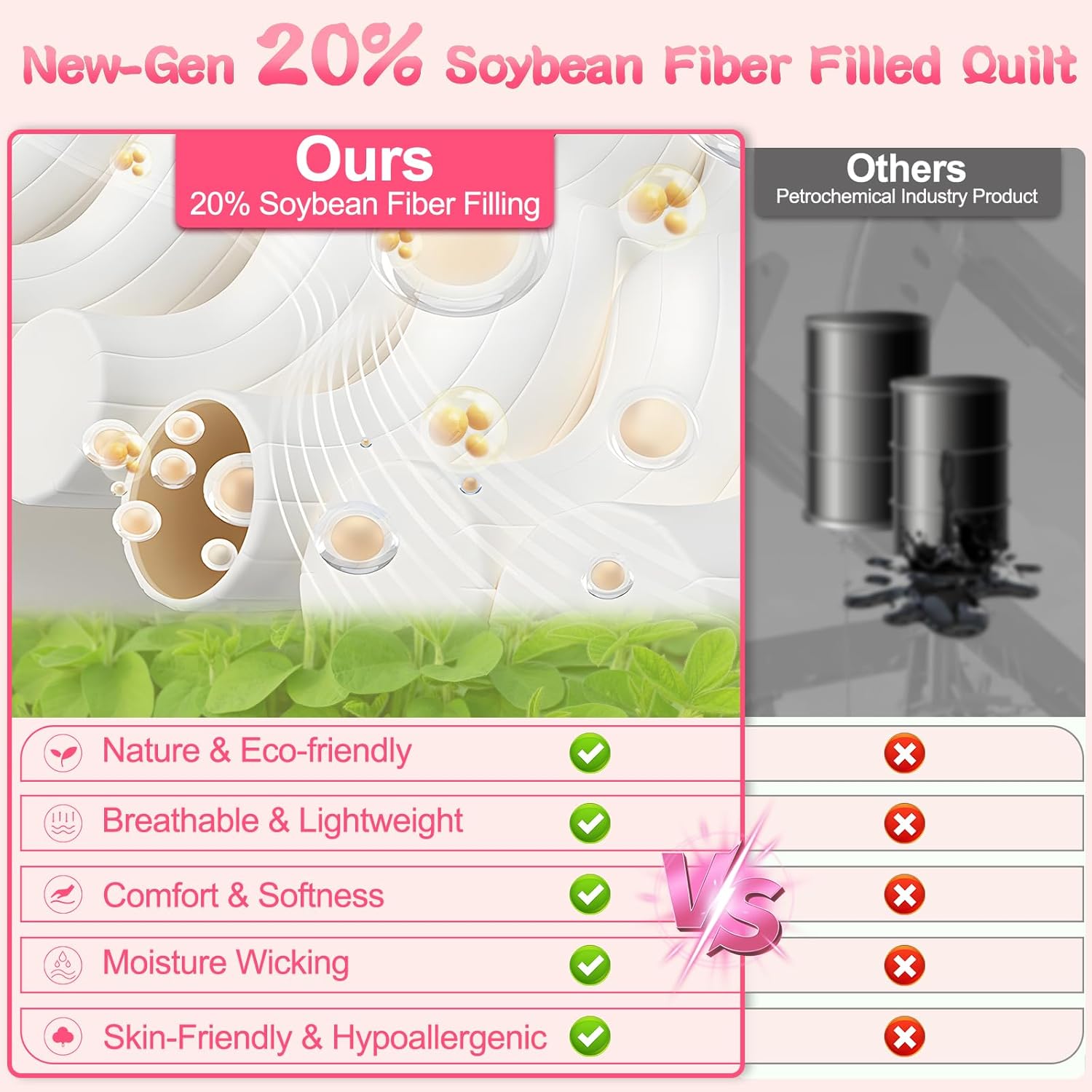 【Soy Fiber Filling: Cloud-like, Lightweight & Breathable】Experience cloud-like softness with our new-gen soybean fiber filling quilt, crafted from protein-spun fibers, more breathable and lightweight than traditional fills. It is filled with 20% soybean fiber + 80% polyester, this scientifically optimized blend can keep you cool in summer and cozy in winter—perfect for hot sleepers or anyone craving a hypoallergenic, eco-friendly option.