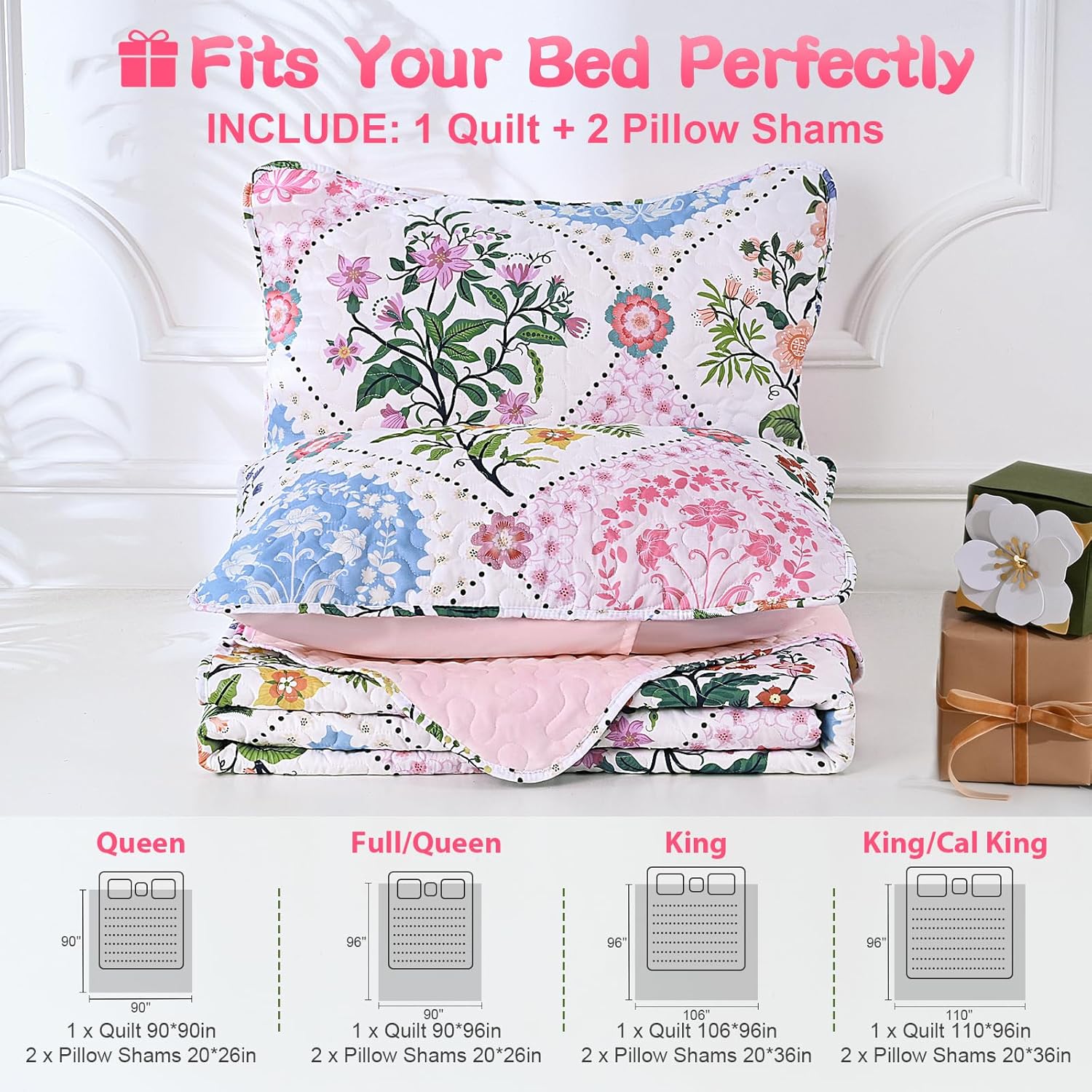 【Package Included】King size set includes 1 quilt (96 x 106 inches) + 2 pillowshams (20 x 36 inches). Measure your bed mattress and choose a suitable size to make it drape nicely to the floor.