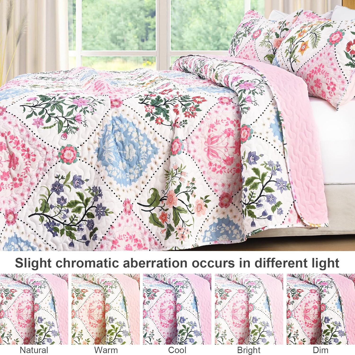 Uspring Quilts King Size Floral Quilt Bedding Set, 3 Piece Lightweight Soft Breathable Quilted Bedspreads Coverlet Sets Summer Comforter with 2 Pillow Shams for All Season (Pink, 96” x 106”)