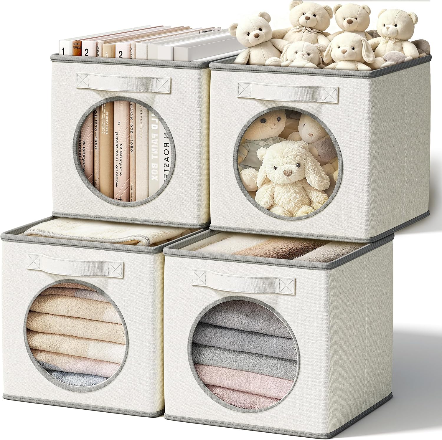 Vailando Foldable Fabric Storage Bins with Round Window – 4 Pack 11″x11″x11″ Collapsible Cube Storage Organizer for Clothes, Shelves, Offices, Toys & Misc, White & Ivory