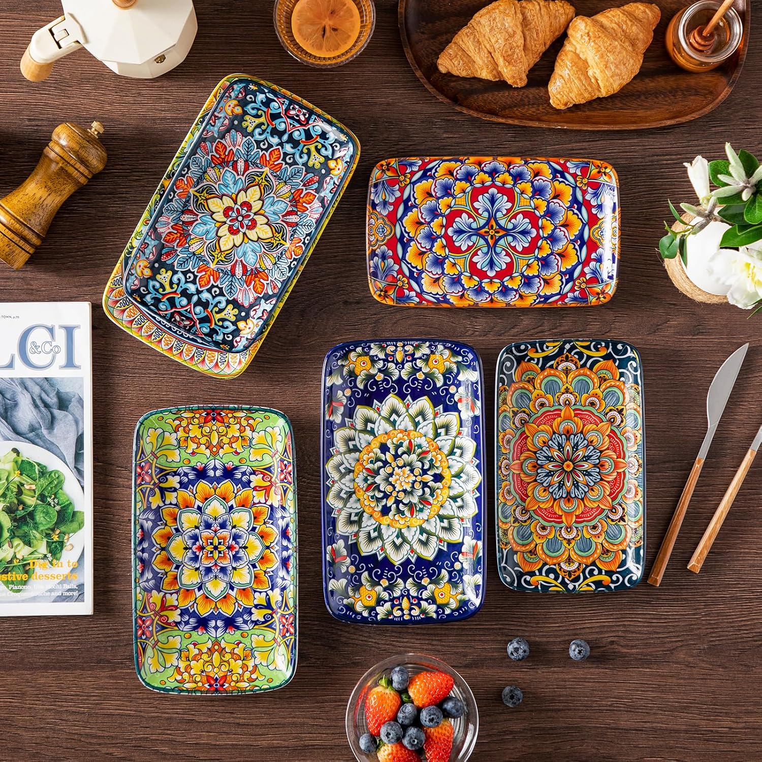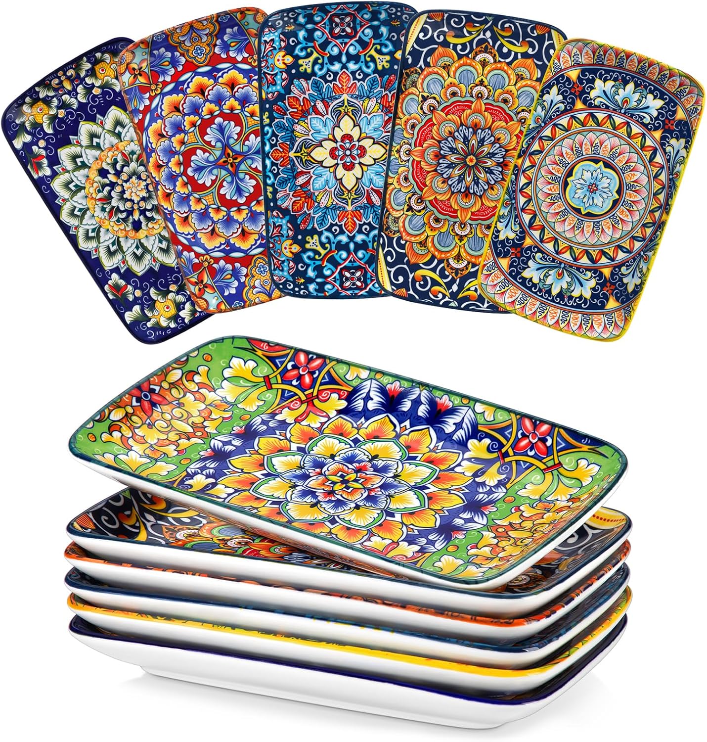 vancasso Simi 9.5 Inch Rectangular Dinner Plates Set of 6 – Bohemian Floral Design in 6 Vibrant Colors, Microwave & Dishwasher Safe Porcelain Plates for Salad, Appetizers, Entertaining