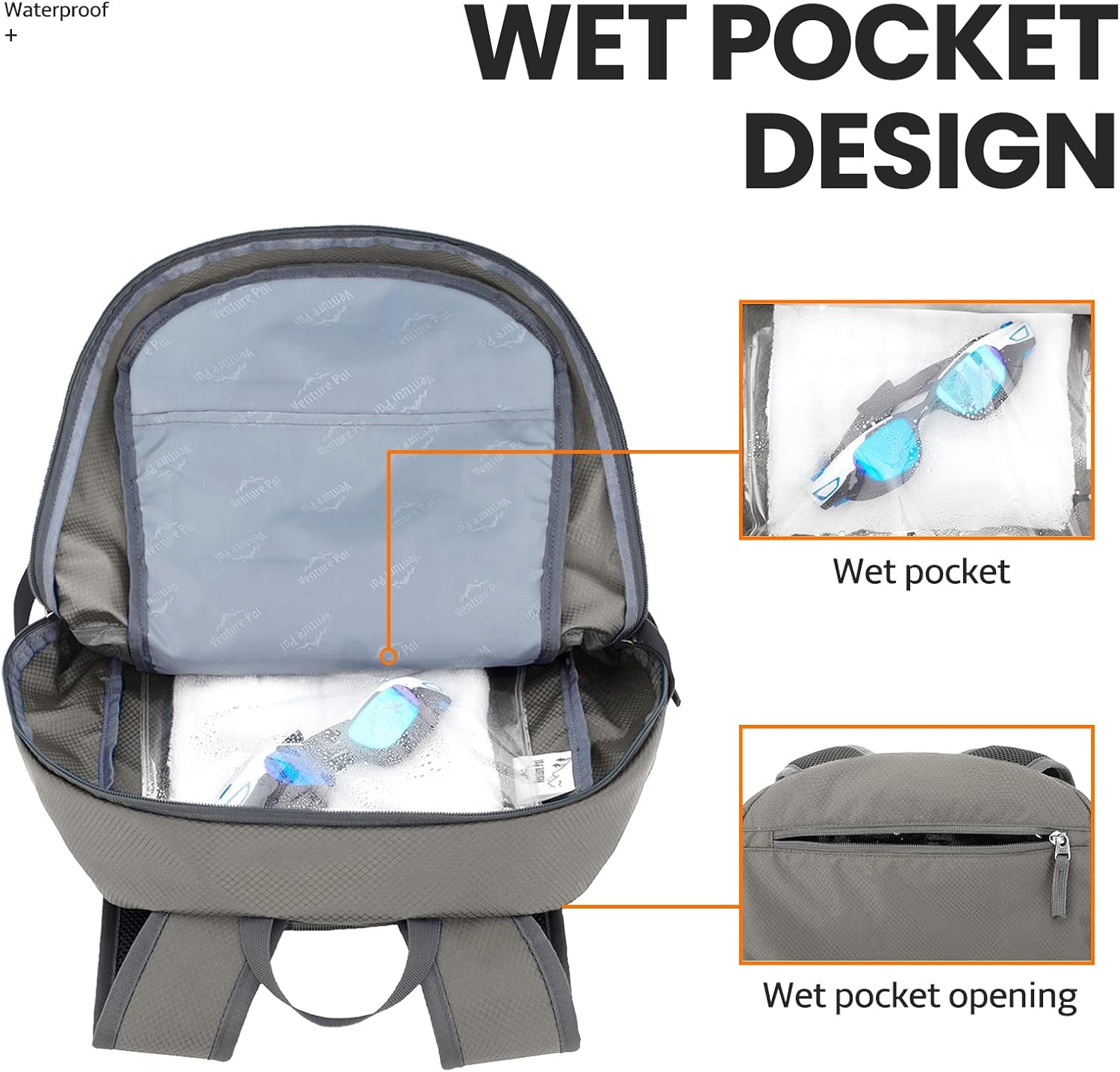 Upgraded Wet Pocket Design: Venture Pal backpack stands out with more humane design for easy and convenient use. One waterproof wet pocket is added to the main compartment, a zipper on the back of this backpack which led to the internal wet pocket, to better separate sweaty clothes, towels or other personal things after swimming or taking exercise