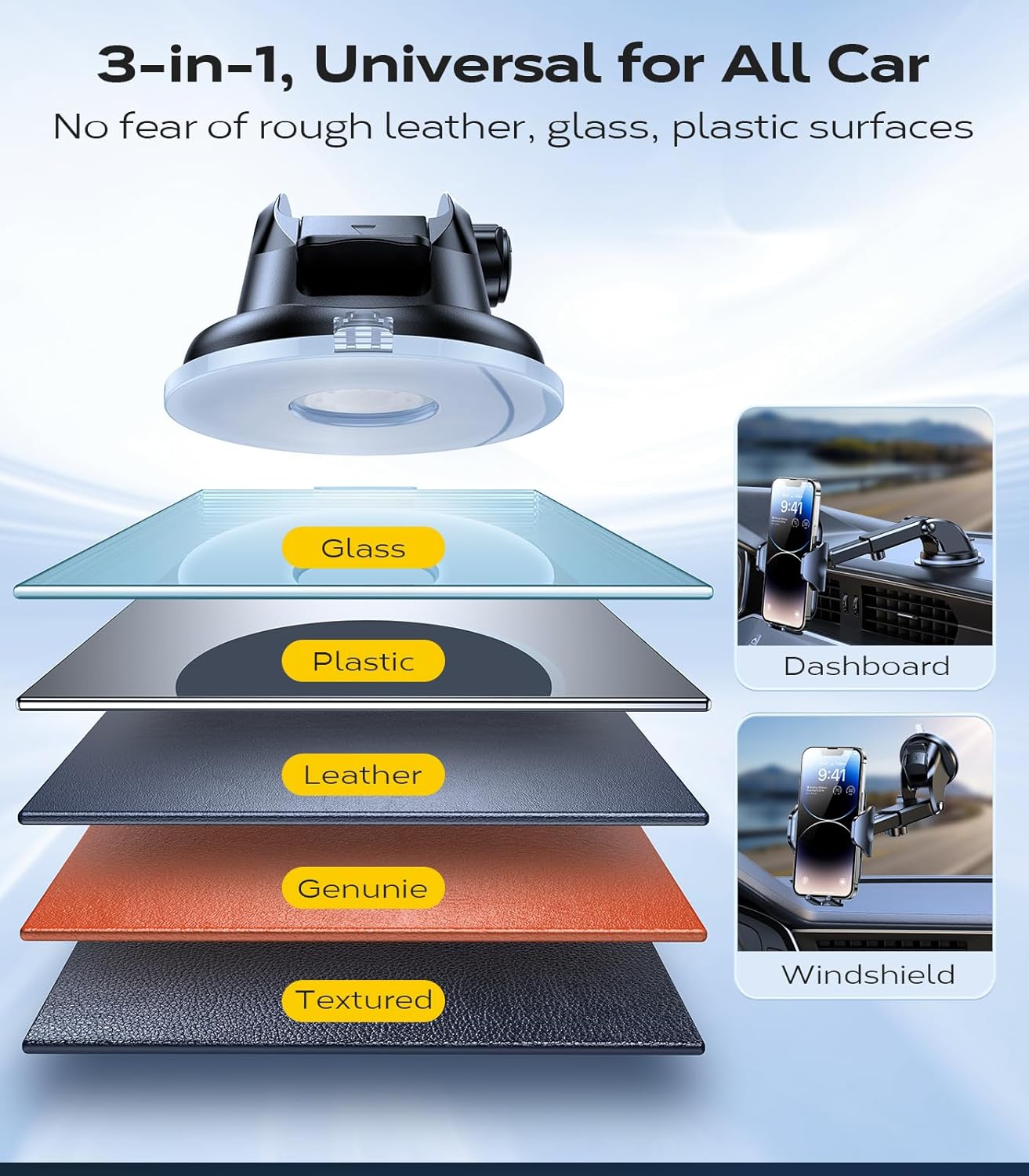 👍【2025 Upgraded Strongest Suction】After 8 years of over 20000 testing materials, Using exclusive synthesis technology of Fluorosilicone Rubber (most heat-resistant material) and nano-adsorbent materials (strongest suction material) to improve car phone mount suction and durability to best ever, suction power increased by 86%, and withstands extreme weather between 44°F to 194°F even under like Minnesota or Florida. Globally patented with EUIPO Patent No 007708805-0001& US No.: US D892,787 S