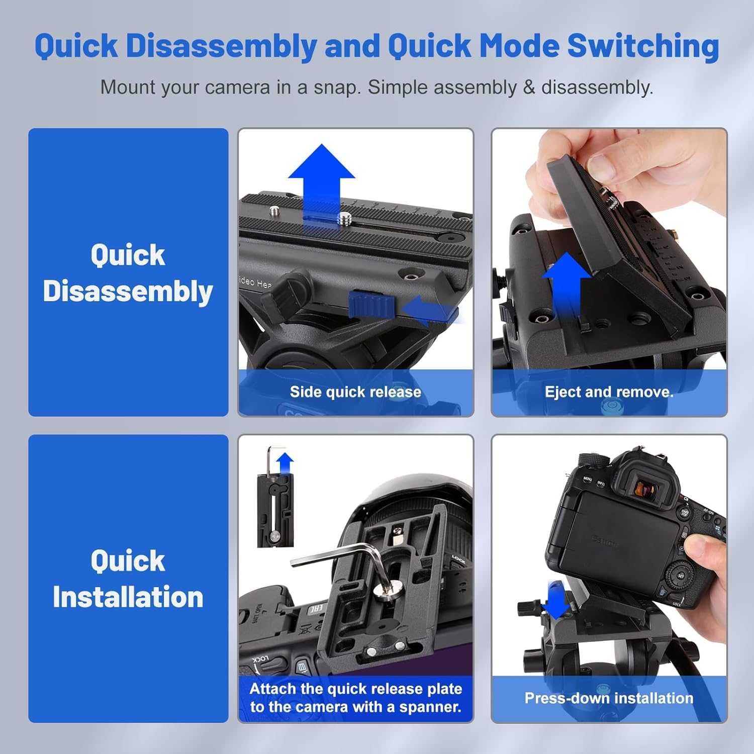 【Unique Quick Plate Upgrade Design】The unique quick plate with spanner inside upgrade design,allows the photographers attach the camera quickly without any other tools