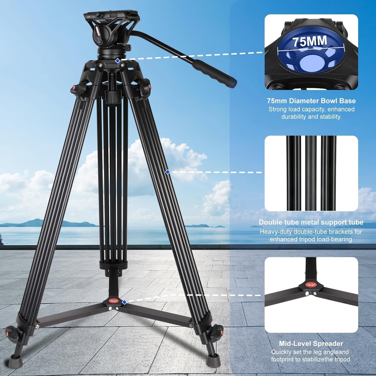 【FLEXIBLE】The tripod head enables flexible camera movement: 360° pan & +90°/-75° tilt. Its 75mm diameter bowel shaped base and head locking handle allow the head to slightly move up and down to fit uneven ground