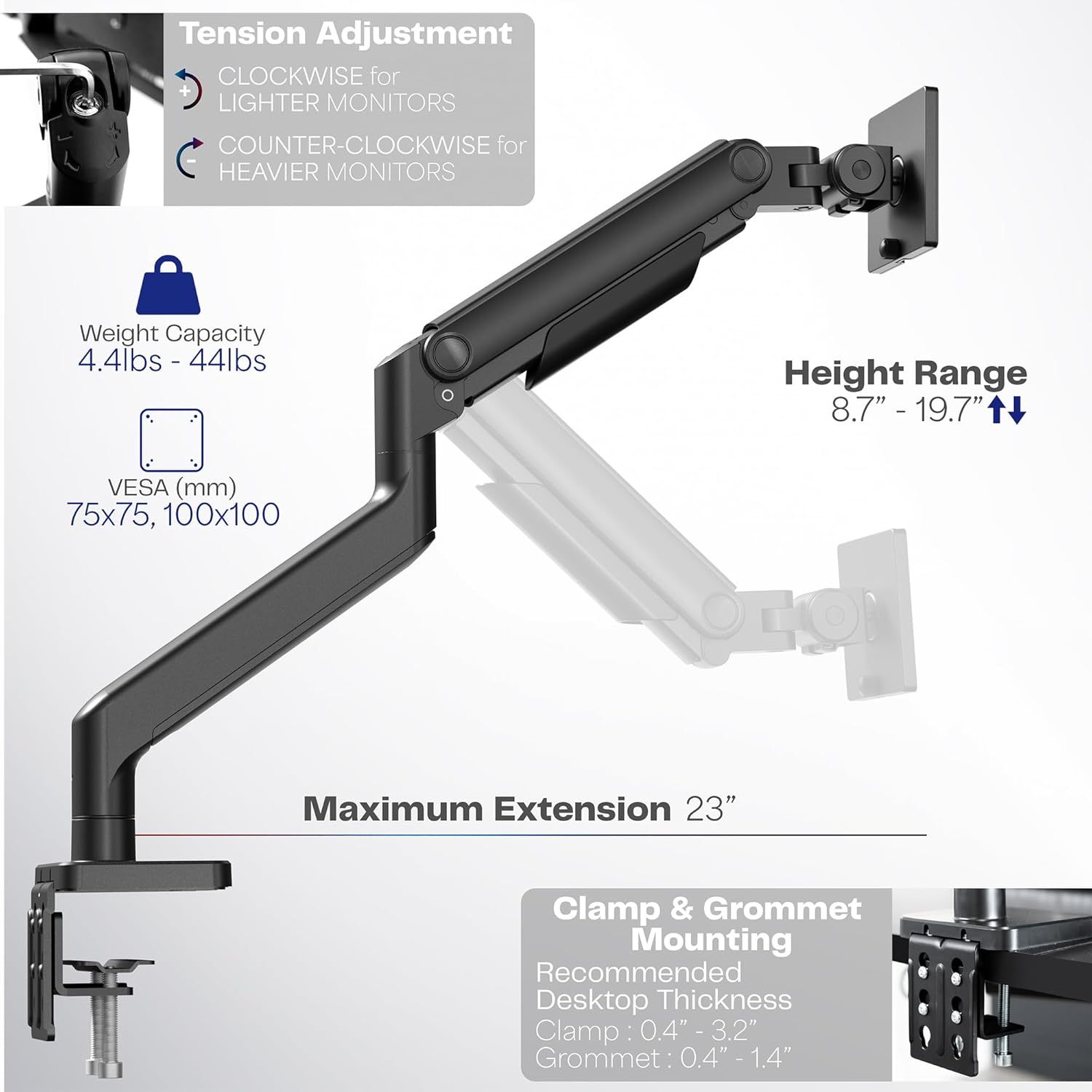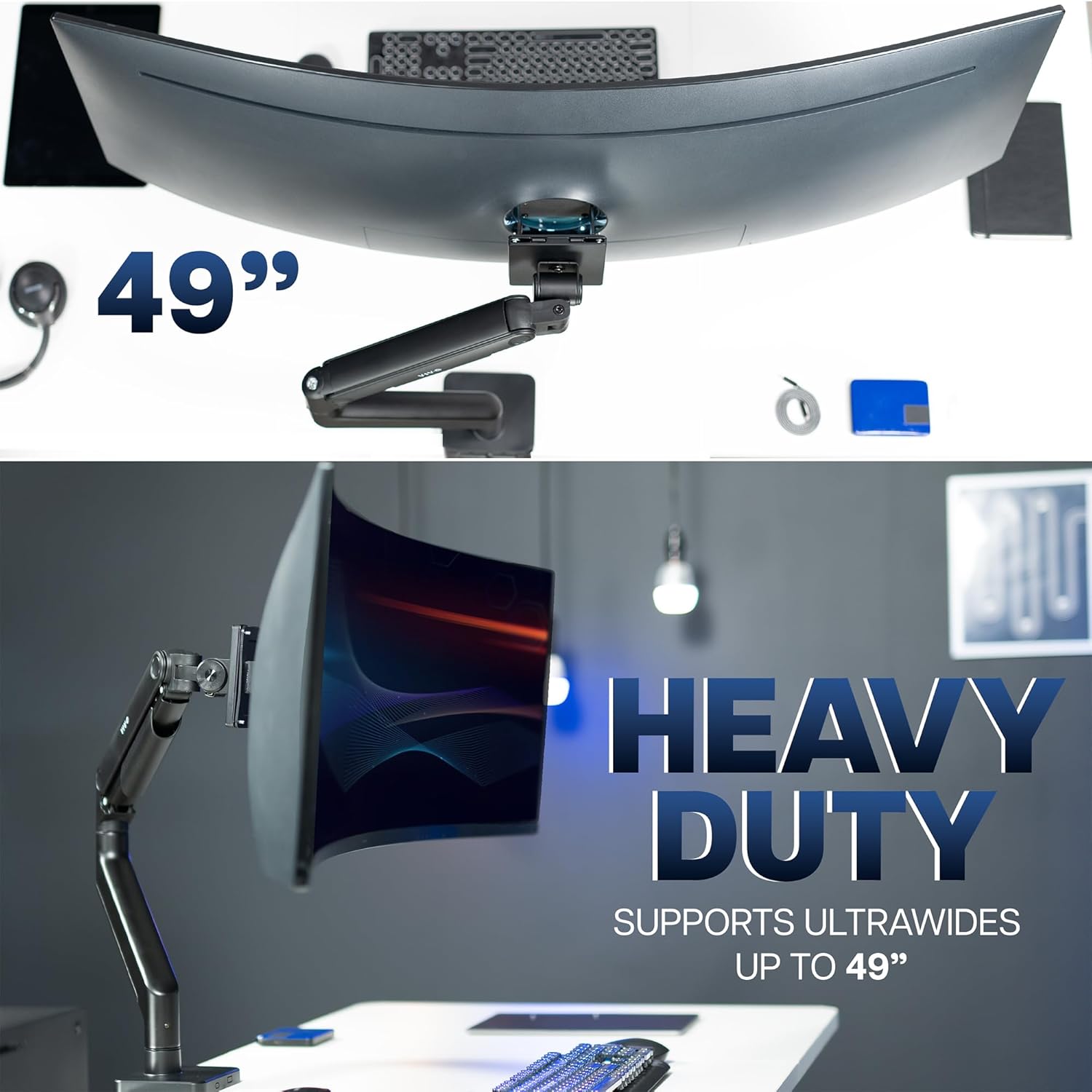 Premium Tension Arm Gaming Mount: Premium spring-assist arm counterbalances the weight of your monitor for optimal ergonomic height adjustments. Ideal for gaming setups, this heavy-duty mount repositions large screens at the touch of a hand
