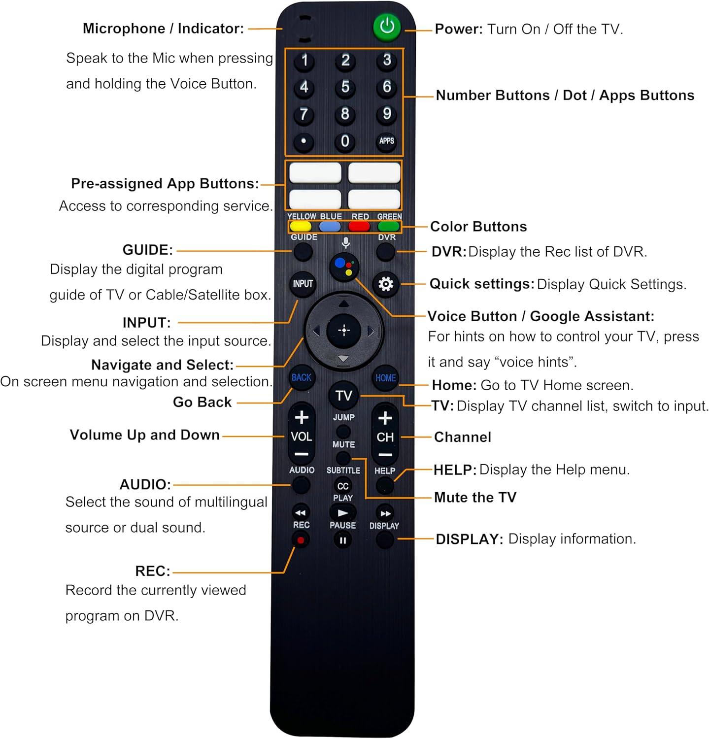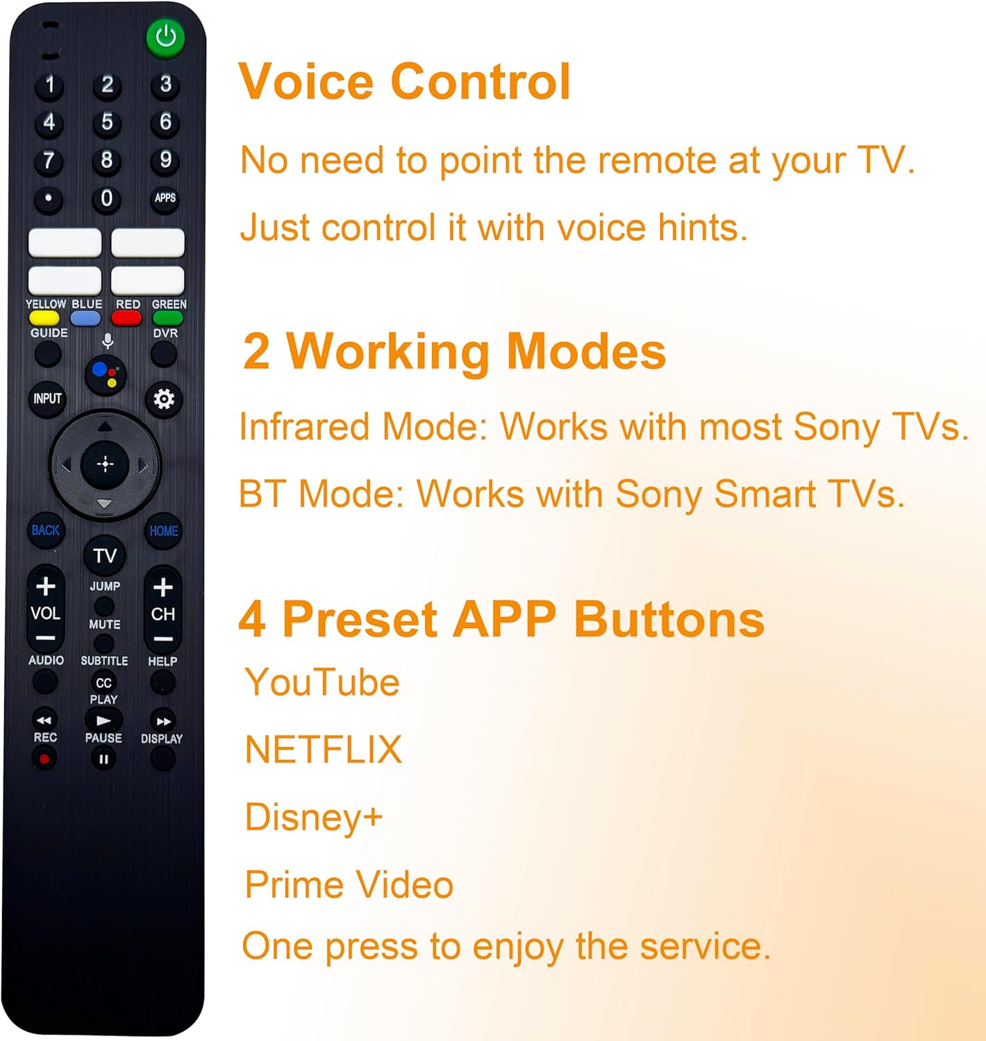 A perfect substitute of these remote controls: RMF-TX920U, RMF-TX910U, RMF-TX900U, RMF-TX820U, RMF-TX811U, RMF-TX810U, RMF-TX800U, RMF-TX621U, RMF-TX611B, RMF-TX611U, RMF-TX600U, RMF-TX520U, RMF-TX520B, RMF-TX500U, having 4 preset app buttons and voice search makes it easier for finding favorite shows.