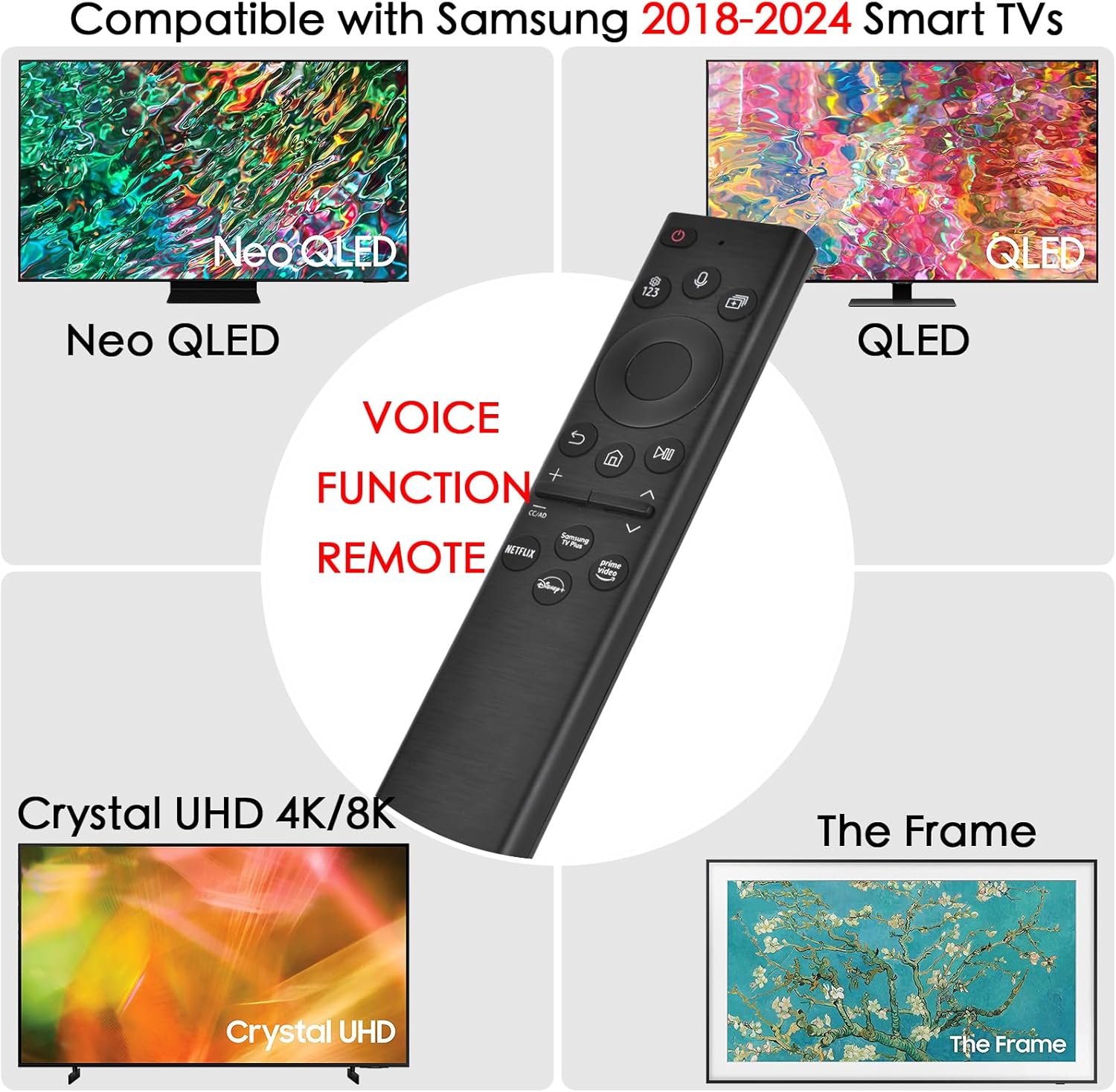 【Compatible with Samsung TV Series】 FOR MOST 2018-2024 MODELS, All Samsung with Voice Function Smart Curved Frame QLED LED LCD 8K 4K UHD TVs. The remote can be backward compatible with some TVS that are not smart enough without voice control, as long as the compatible TV has remote control function, it can also be used.