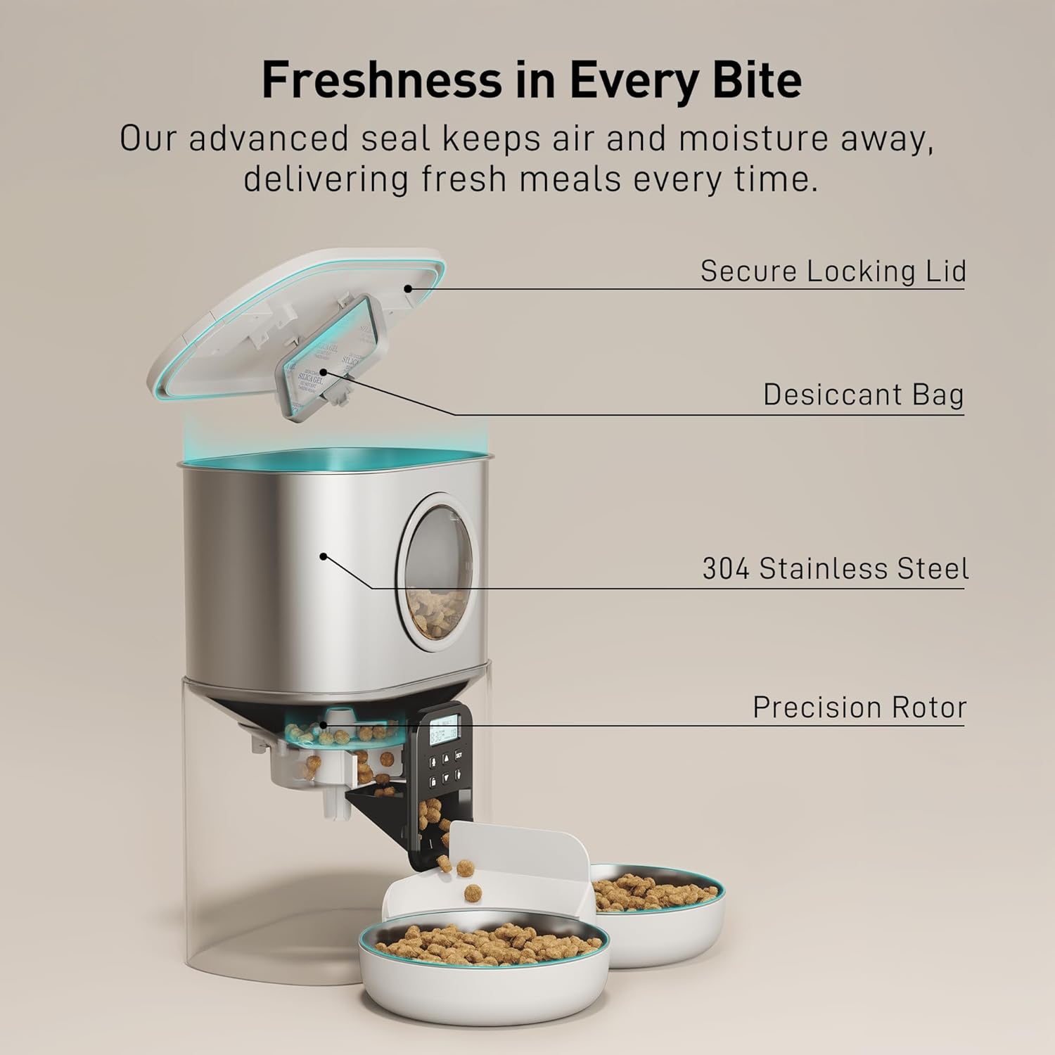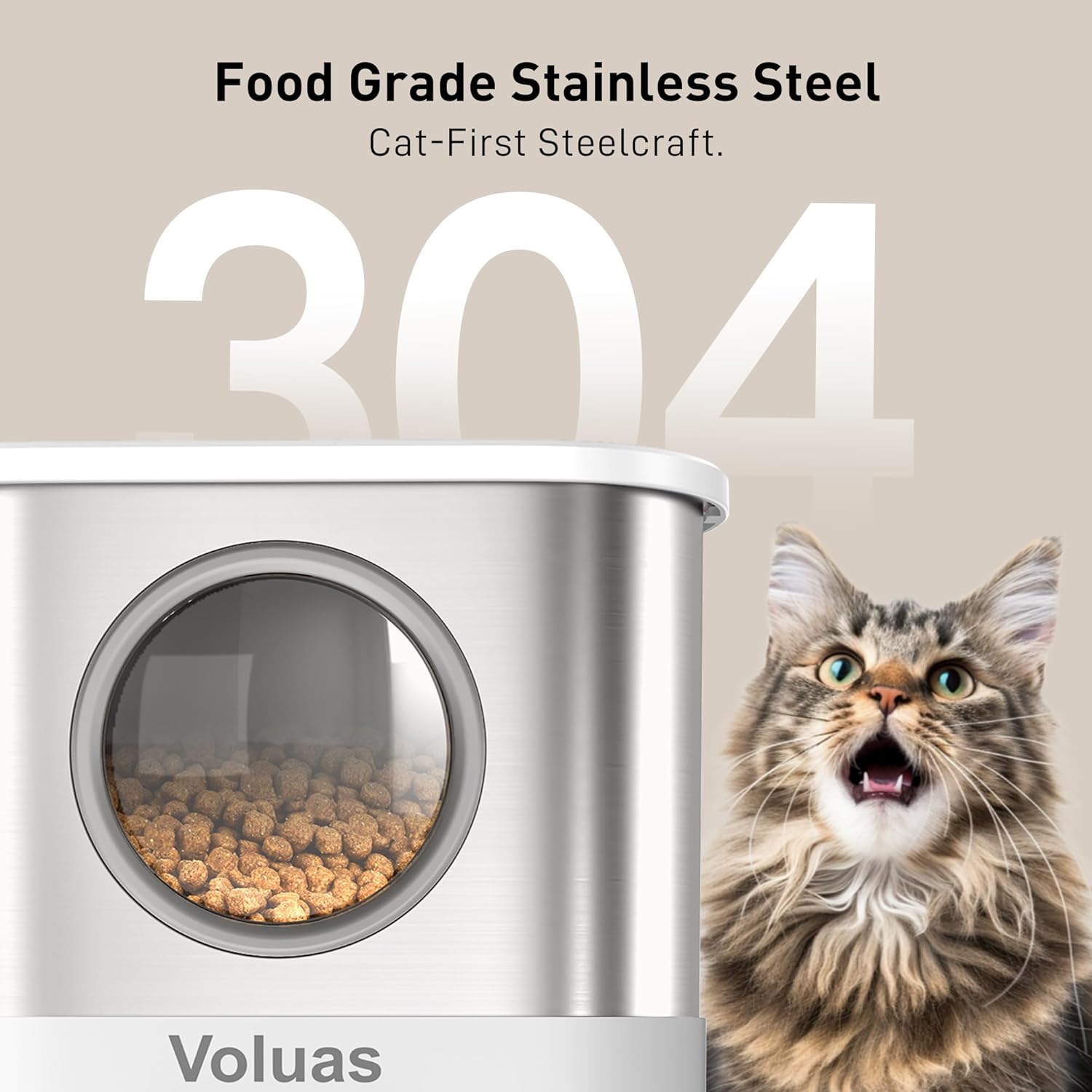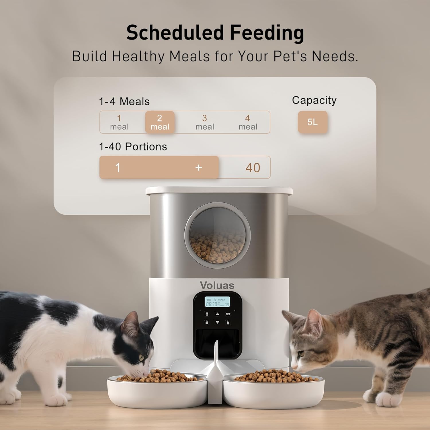 VOLUAS Automatic Cat Feeders for Two Cats,Stainless Steel 5L Pet Feeder for Cats and Dogs Timed Cat Feeder Pet Dry Food Dispenser, White