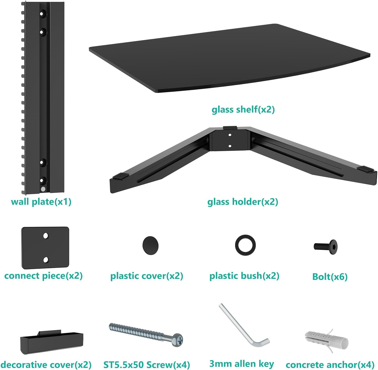 Package Includes: 1 x WALI Floating Shelf System (Black), 2 x Strengthened Tempered Glass, Mounting Hardware Kit, User Manual, experienced and friendly US based customer support available to assist 7 days a week.