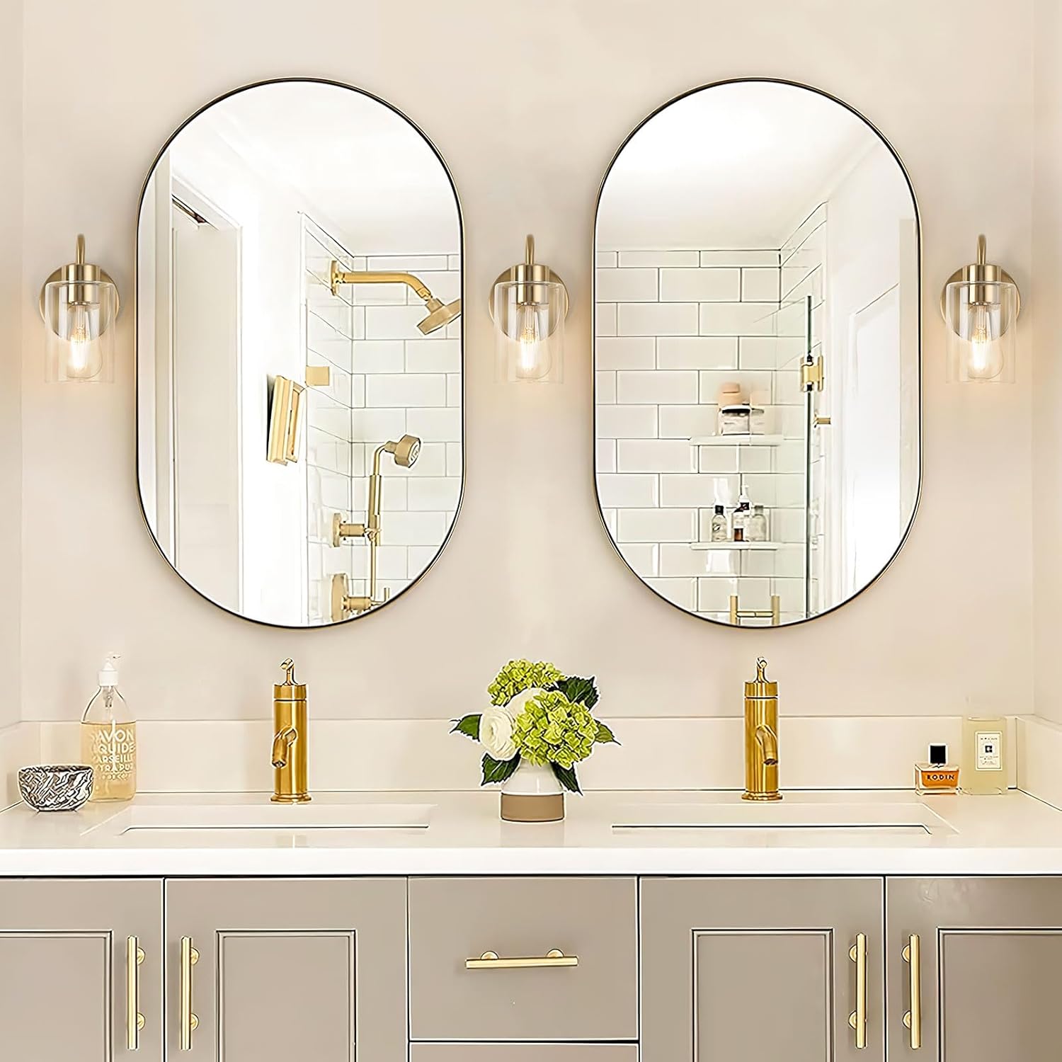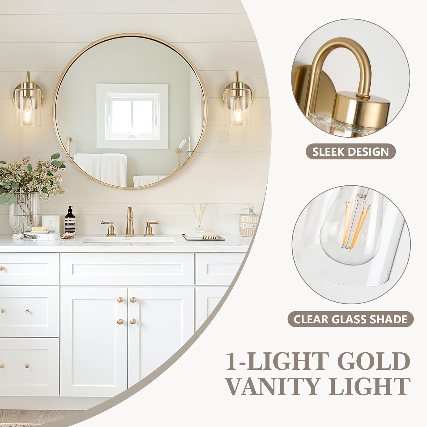 【Modern & Stylish Design】Elevate your space with this improved gold wall sconces set of 2. Crafted from sturdy metal with a durable gold finish and premium thicker glass shades. Resistant to rust, moisture, and corrosion, this bathroom light fixture offers years of reliable use. Its sophisticated design complements any decor style, from modern to rustic, adding an exquisite touch of contemporary charm to your home lighting