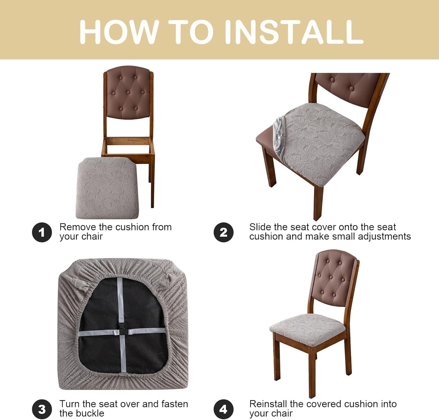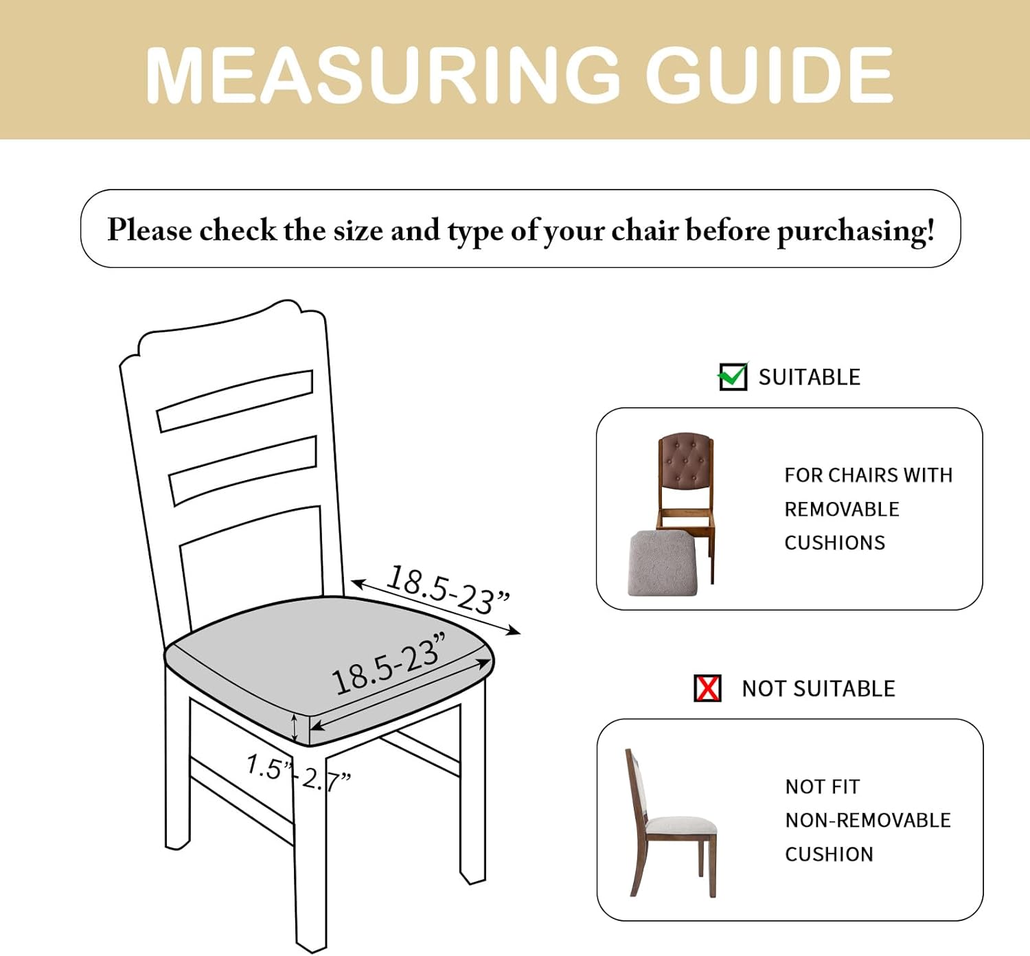 Suitable for Cushion Size – This chair seat covers for dining chairs in two sizes to fit different dining chairs. Small size fits cushions 15″-19″ in length and width. Large size fits cushions 18″-23″ in length and width. Both sizes seat cushion thickness 1.5″-2.7″.Please refer to the measurement guide provided in the product images to ensure a perfect fit for your chairs.