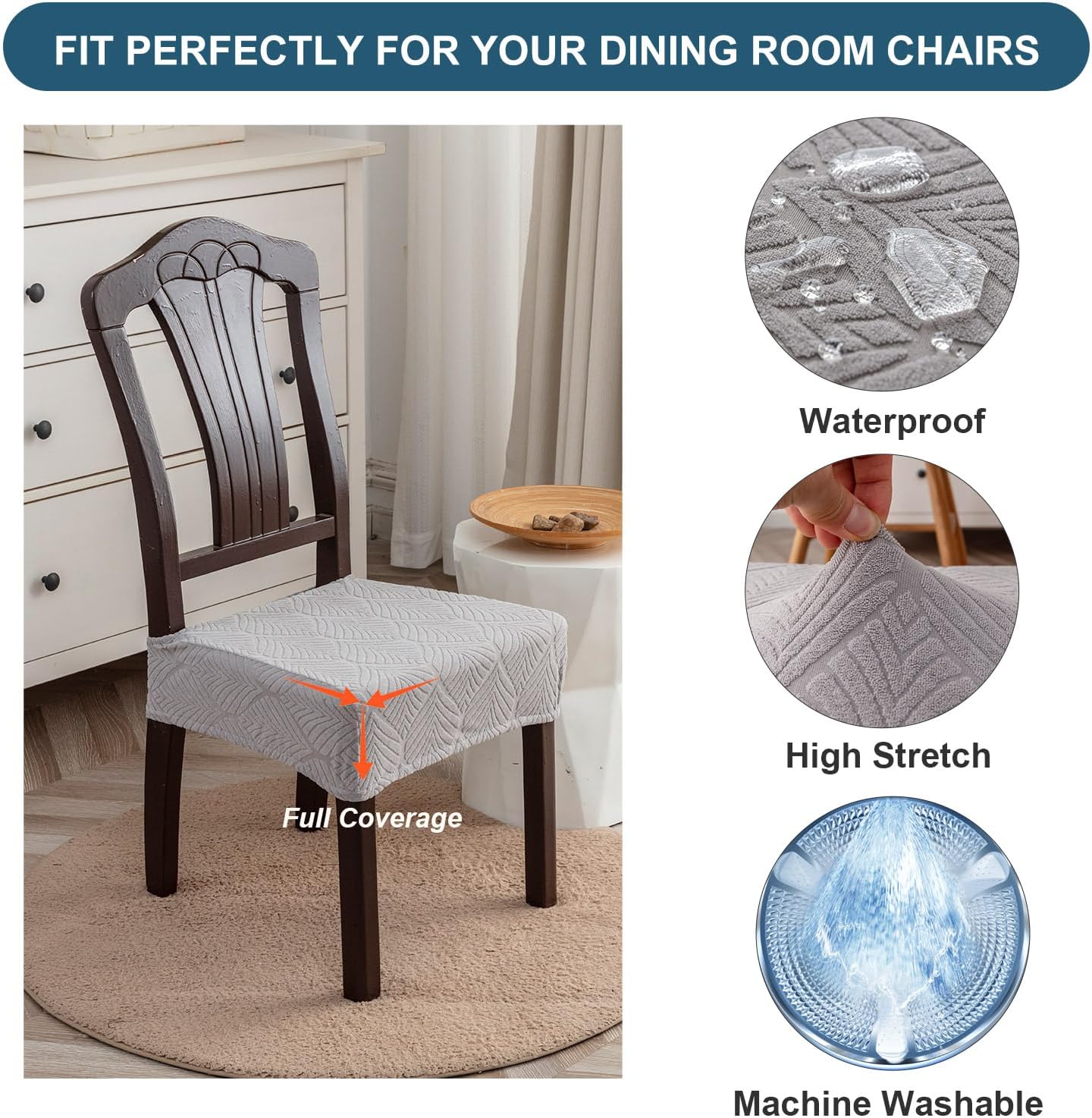 【High Stretch & Waterproof Chair Seat Covers】The seat covers adopt high stretch thicken fabric to fit for different size chairs and protect your dining room chair cushion from pets scratch.Besides, the 100% waterproof coating and backing design of chair cover also provide double protection from liquid spill or food stain.