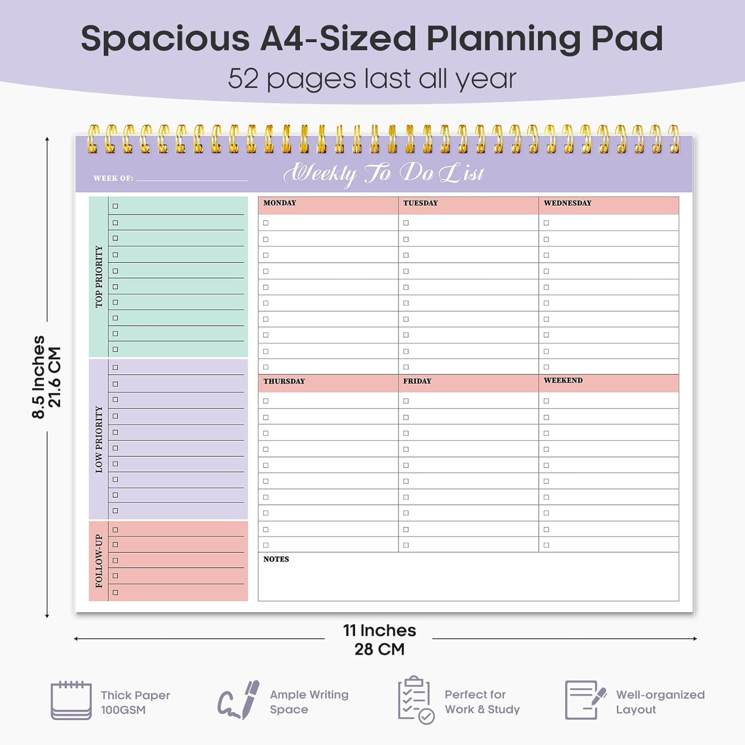 High-Quality Design – Our weekly desk planner is crafted with attention to detail, using premium quality 60-pound smooth white paper and a sturdy chipboard backing. Measuring at a convenient size of 11 X 8.5 inches (A4), it offers ample space for writing and planning your tasks. The clean and elegant design adds a touch of sophistication to your workspace.