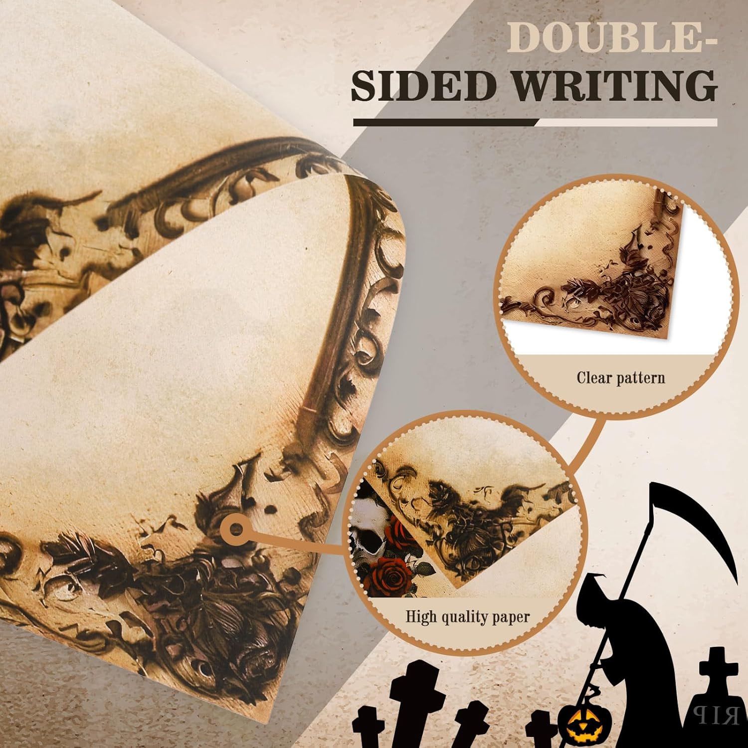 Gothic Design: Our letter paper is double-sided, featuring Halloween-themed edge design, skull, rose, crow, castle, exquisite and vintage, full of gothic style, great stationery supplies for many occasions, especially for Halloween