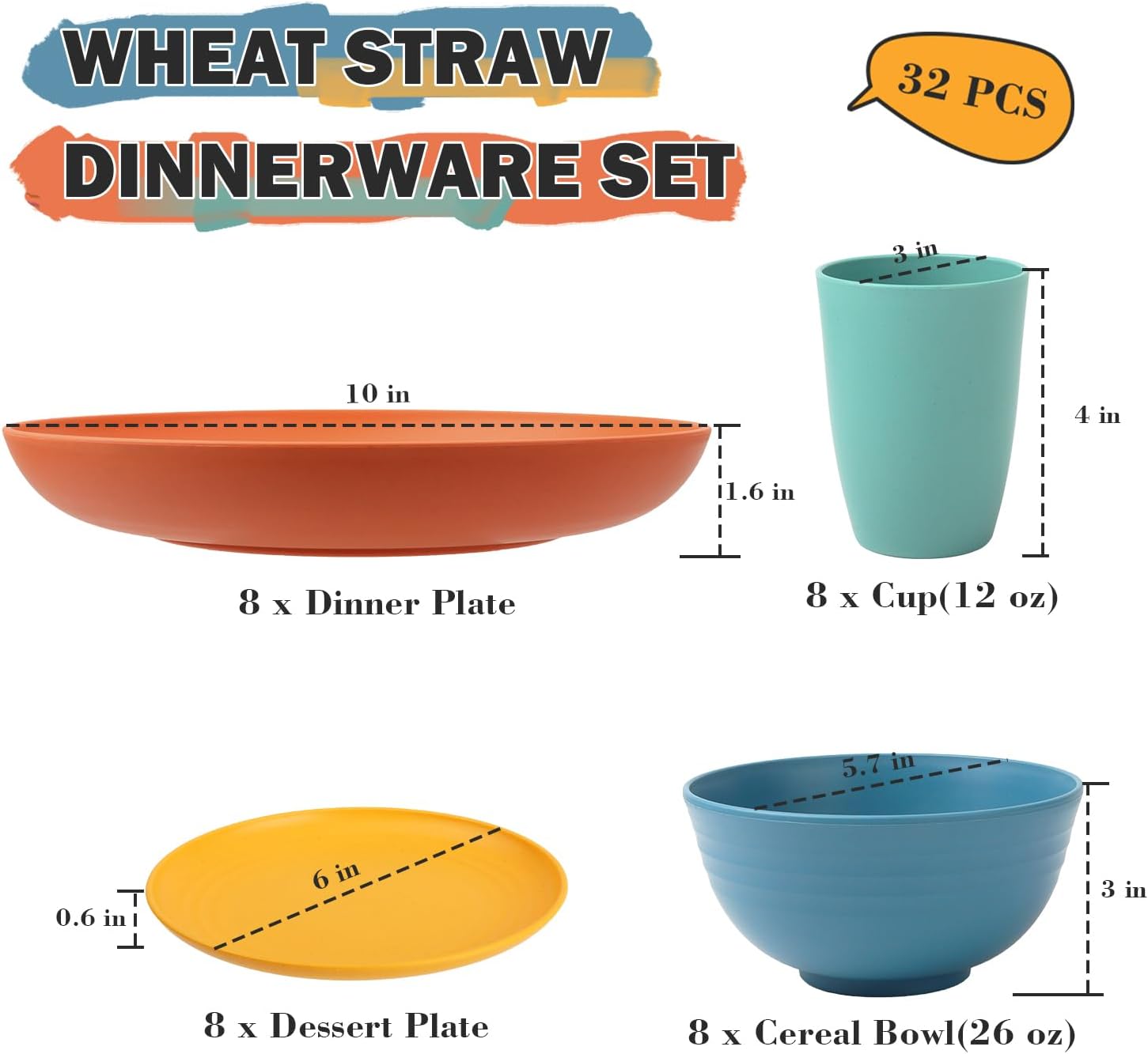 Wheat Straw Dinnerware Sets, Plates and Bowls Sets Unbreakable & Microwave Safe – 32 Piece Service for 8 Dinner Plate Dessert Plate Cereal Bowl Cup for Kitchen & Outdoor – Multi