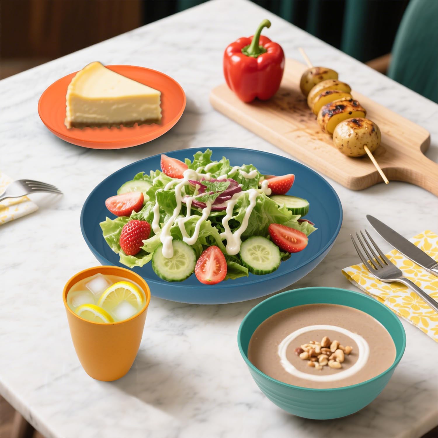 VERSATILE FOR EVERY OCCASION: From backyard picnics to camping trips or simple family dinners at home, this wheat straw dish set fits right in. The sturdy plates and bowls add ease to everyday meals, office lunches, outdoor barbecues – even road trips. Their vibrant design and practical size make every gathering, big or small, a breeze