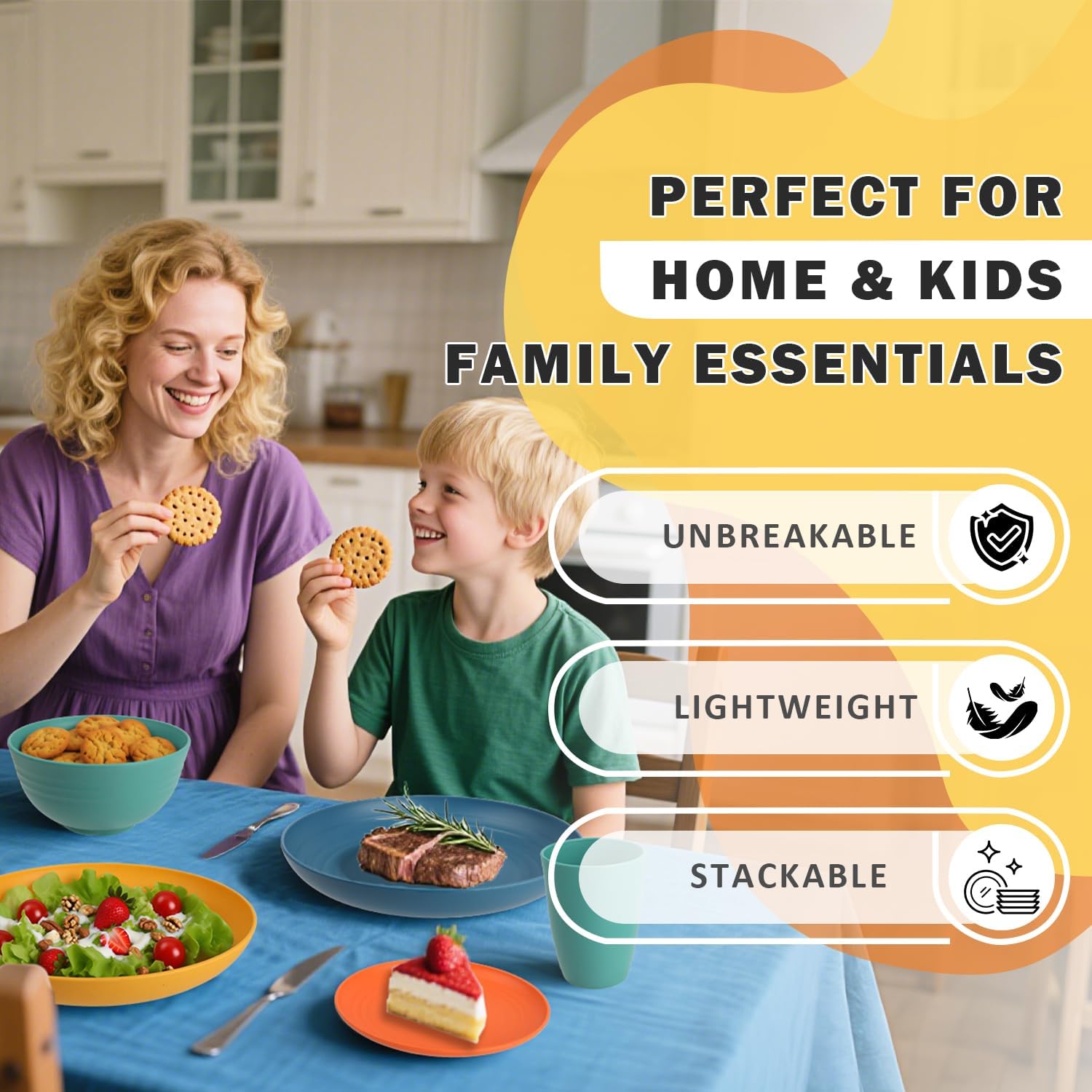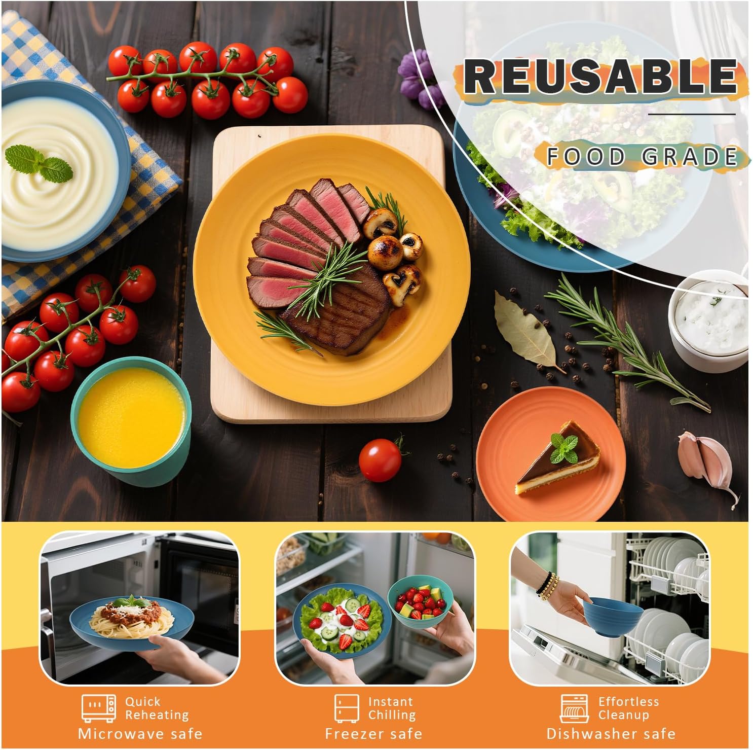 SAFE & UNBREAKABLE CONSTRUCTION: Designed with your family’s health in mind, this dinnerware set combines wheat straw fiber and food-grade PP plastic – BPA-free for everyday use. Unlike traditional plastic or ceramic that easily break, chip, or crack, these plates and bowls are built to last: their unbreakable design withstands accidental drops, making them ideal for homes, camping trips, RVs, or busy kitchens. The sustainable, reusable material ensures long-term durability, providing a practical solution for meals at home or on the go