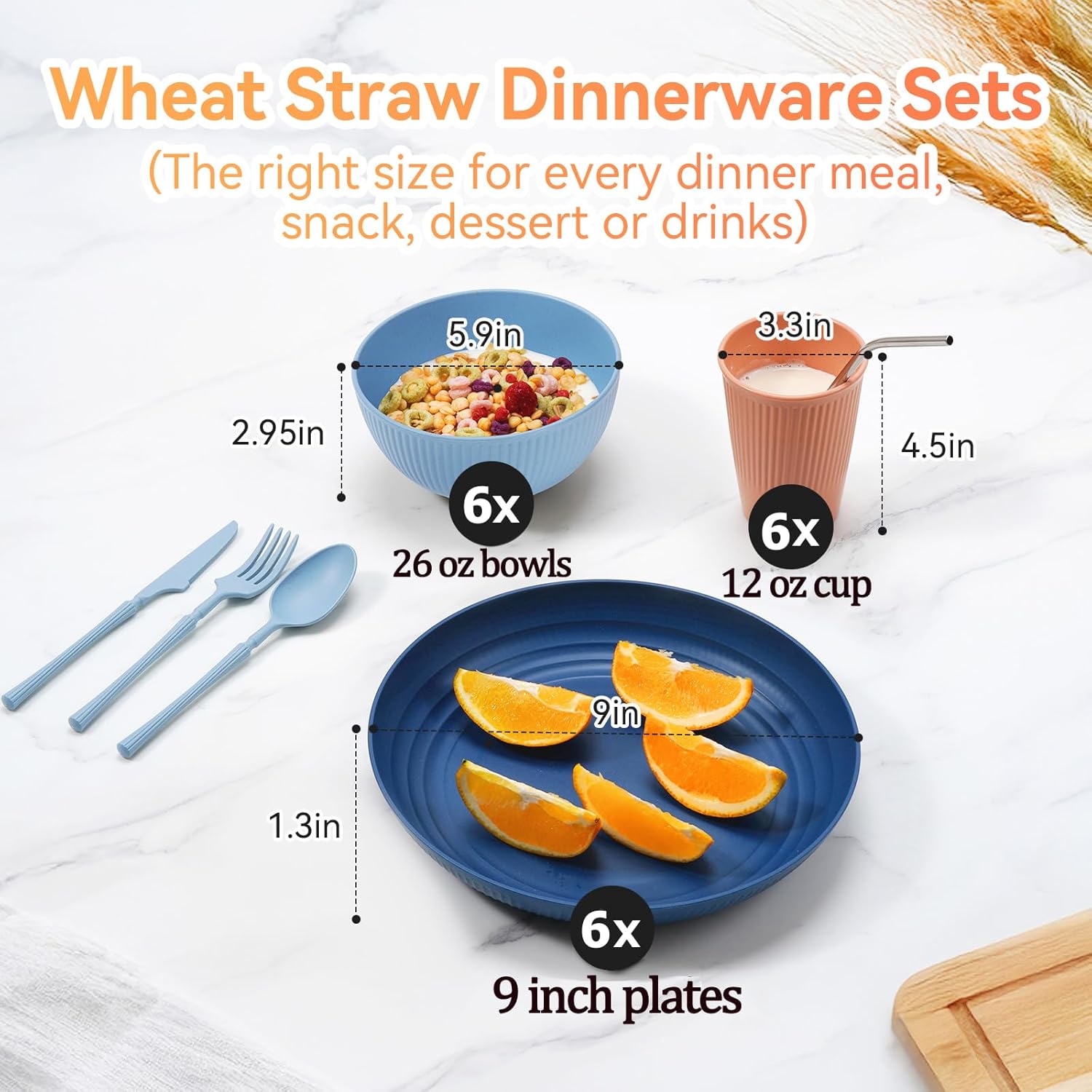 PACKAGE INCLUDE: Our Gray wheat straw dinnerware set, featuring 42 pieces of 6 x 9 inch plates, 6 x 26 oz bowls, 6 drinking cups and utensils-6 x 7.3 knives, 6 x 7.3 forks, 6 x 7.3 inch spoons & 6 x 8.3 straws.They are great for picnic, parties, camping & everyday meals, drinks at home, office, school outdoor or traveling. Great as travel essentials.