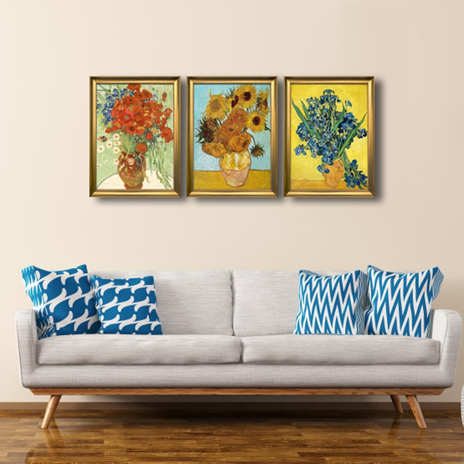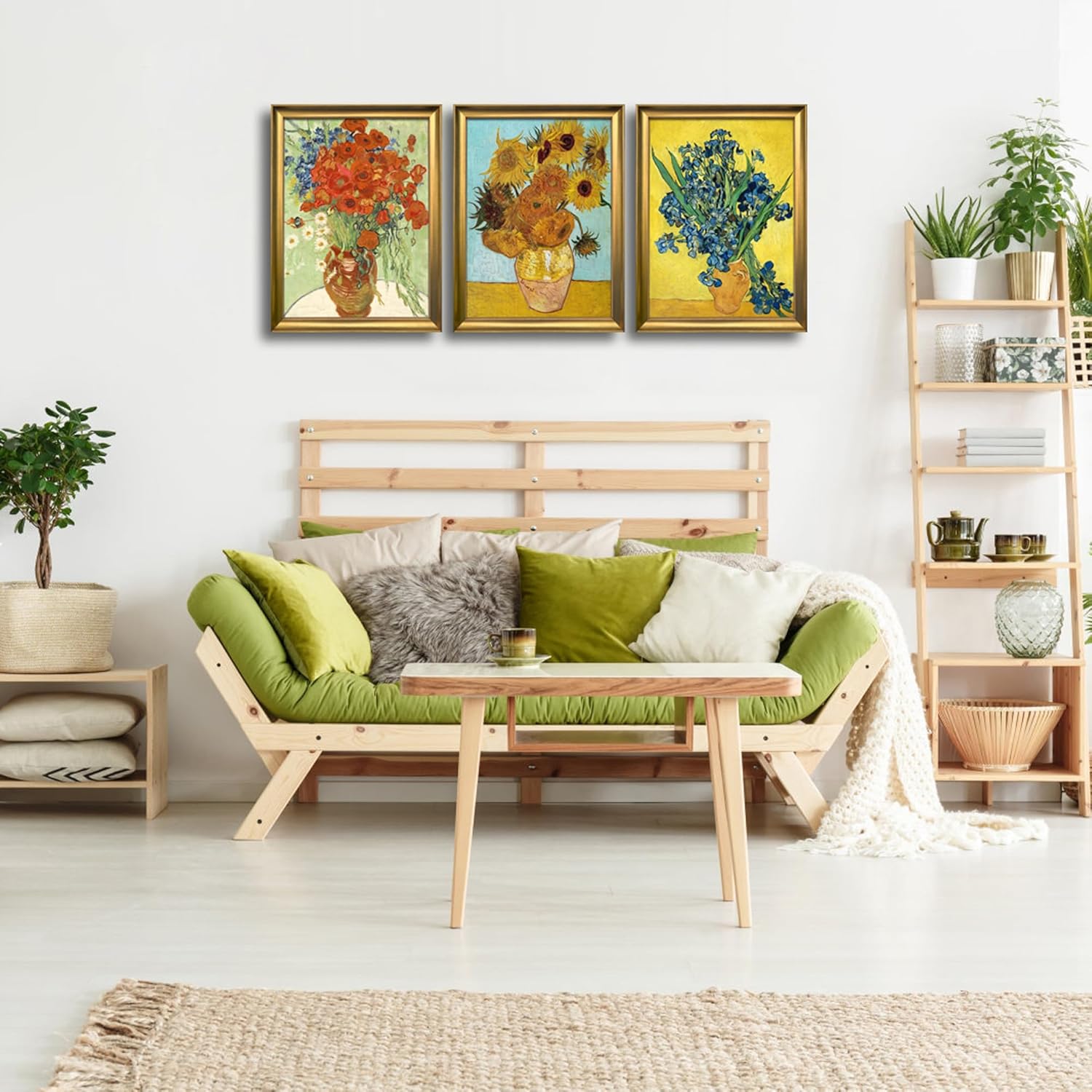 Wieco Art Framed 3 Panels Wall Art of Vincent Van Gogh Paintings Red Poppies and Daisies Sunflower Irises in Vase Canvas Prints for Wall and Home Decorations Bronze Gold Frame