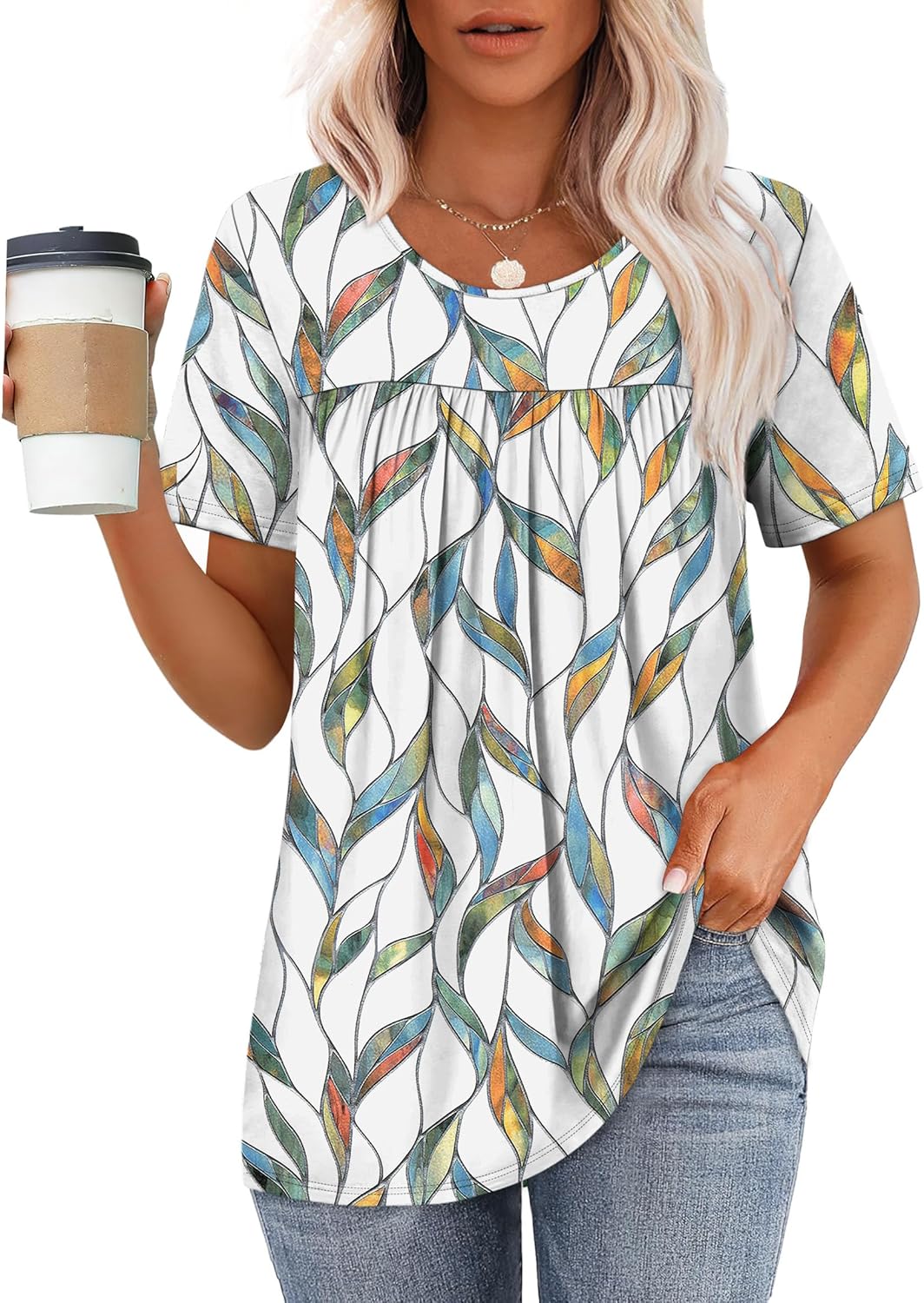 Designed with a flattering crewneck, short sleeves, and a flowy pleated front, this womens t shirt combines style and comfort, making it one of the best short sleeve shirts for women