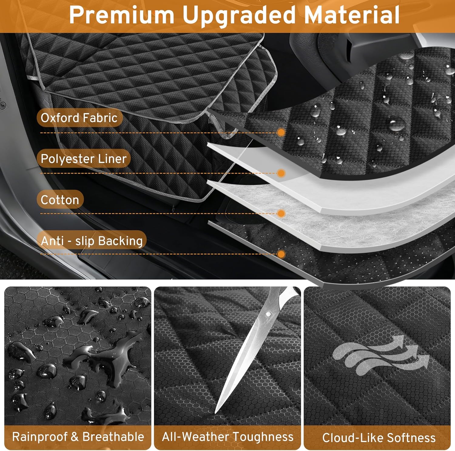 【Premium Material】: These car seat covers feature a high-quality diamond-stitched design, made of sturdy 600D oxford cloth and thick PP cotton fabric, preventing dog nails from scratching and damaging the leather seats.