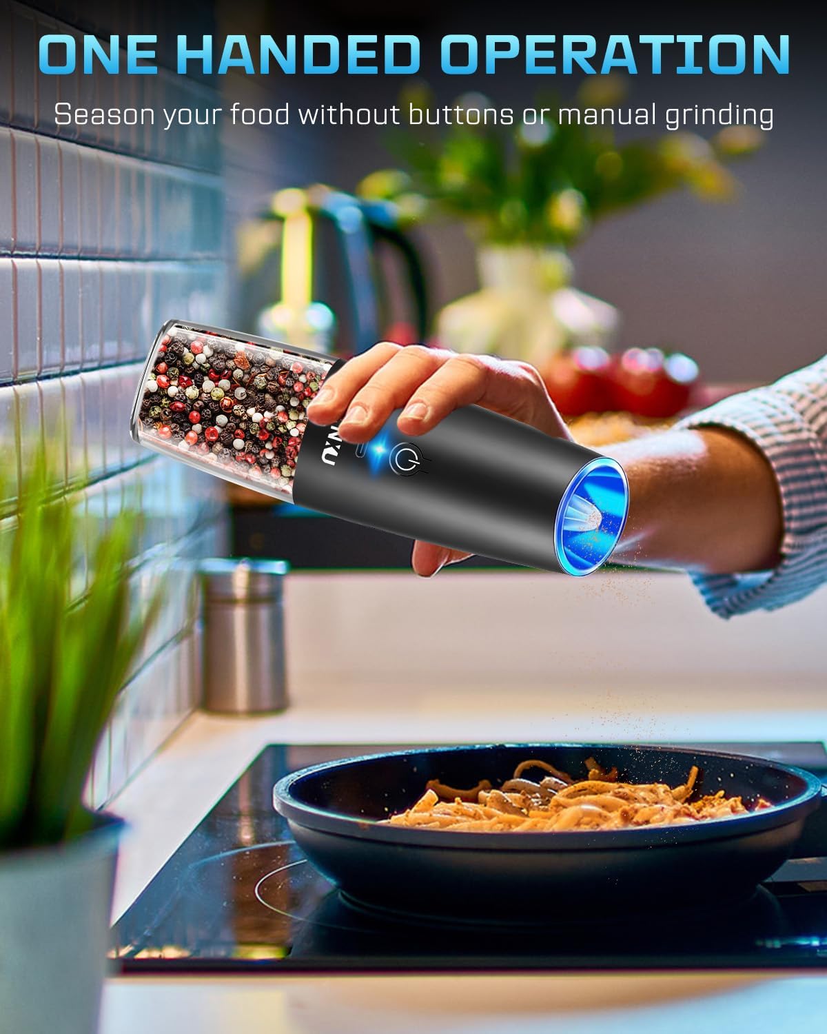 【Gravity Switch】 Our electric pepper and salt grinder comes with a gravity sensing switch, press the button and simply flip the grinder over to grind fresh spices, easy, convenient and fun. NOTE: Please turn on the automatic switch before use.