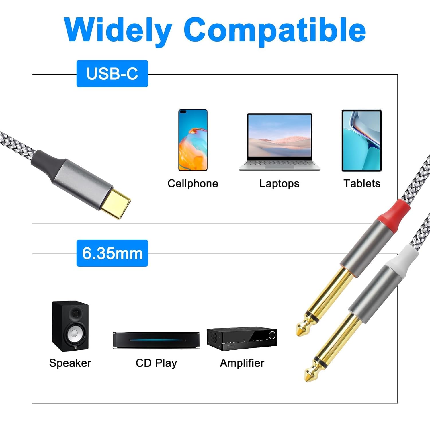 ♫USB C type-C to 6.35mm 1/4 inch male, supporting all devices with standard USB C type Aux sockets (smartphones, tablets, laptops, PC); Support all devices with 6.35mm socket (guitar, speaker, mixer, recorder, amplifier, Mixing console)