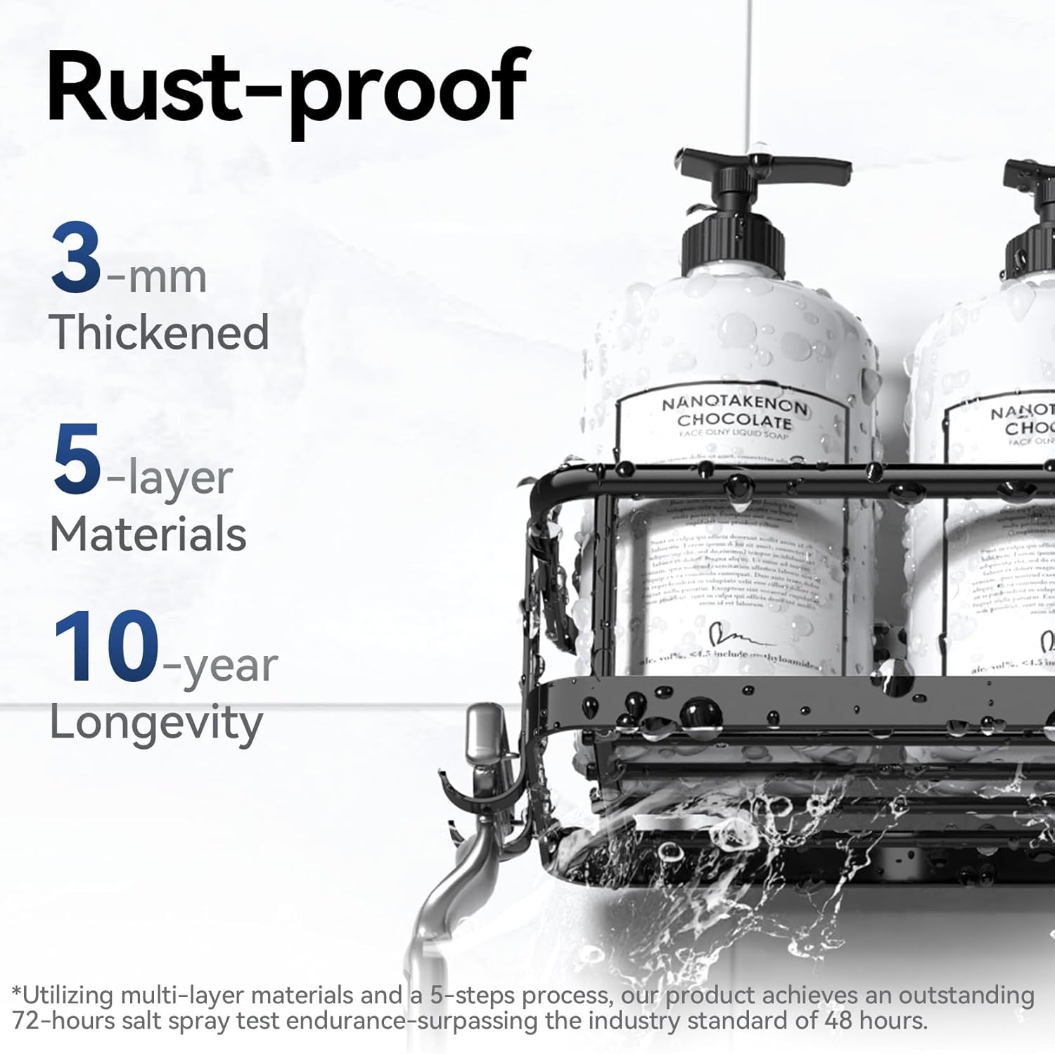 100% Rust-Proof: 3mm reinforced wires and 5-Layer rustproof armor coating, survived 72hr ASTM B117 salt spray & 10,000 bend tests. 2X longer lifespan than basic shower shelf for inside shower