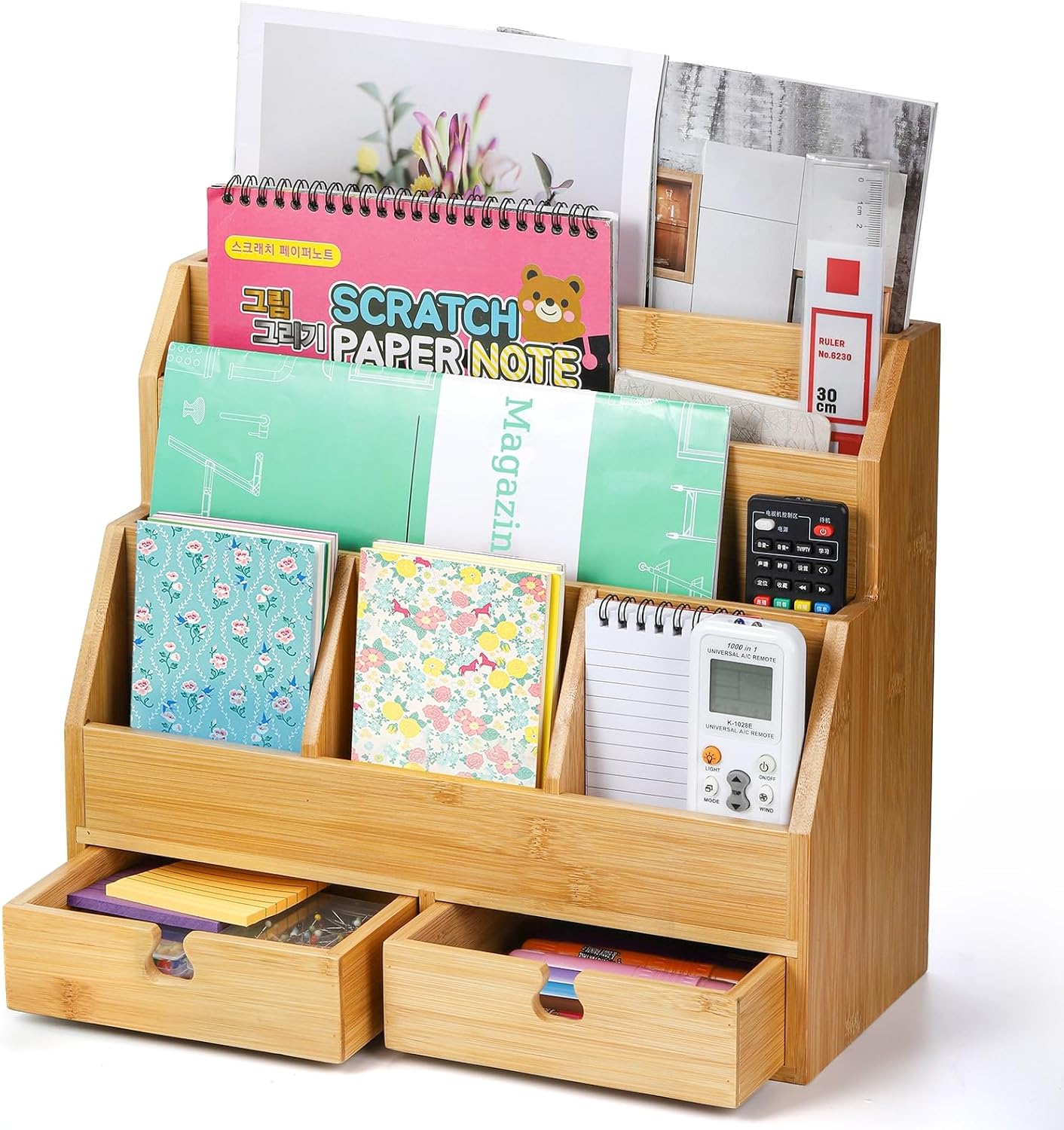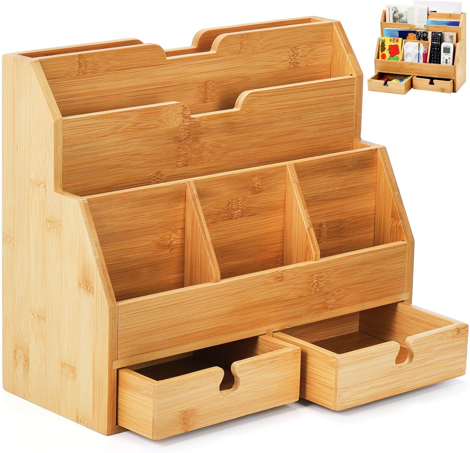 Youeon Bamboo Desk Mail Organizer with Drawers, Large Office Desk Organizer, Countertop Magazine File Holder, Desk Organizer and Sorter for File Letter Paper Office Supplies