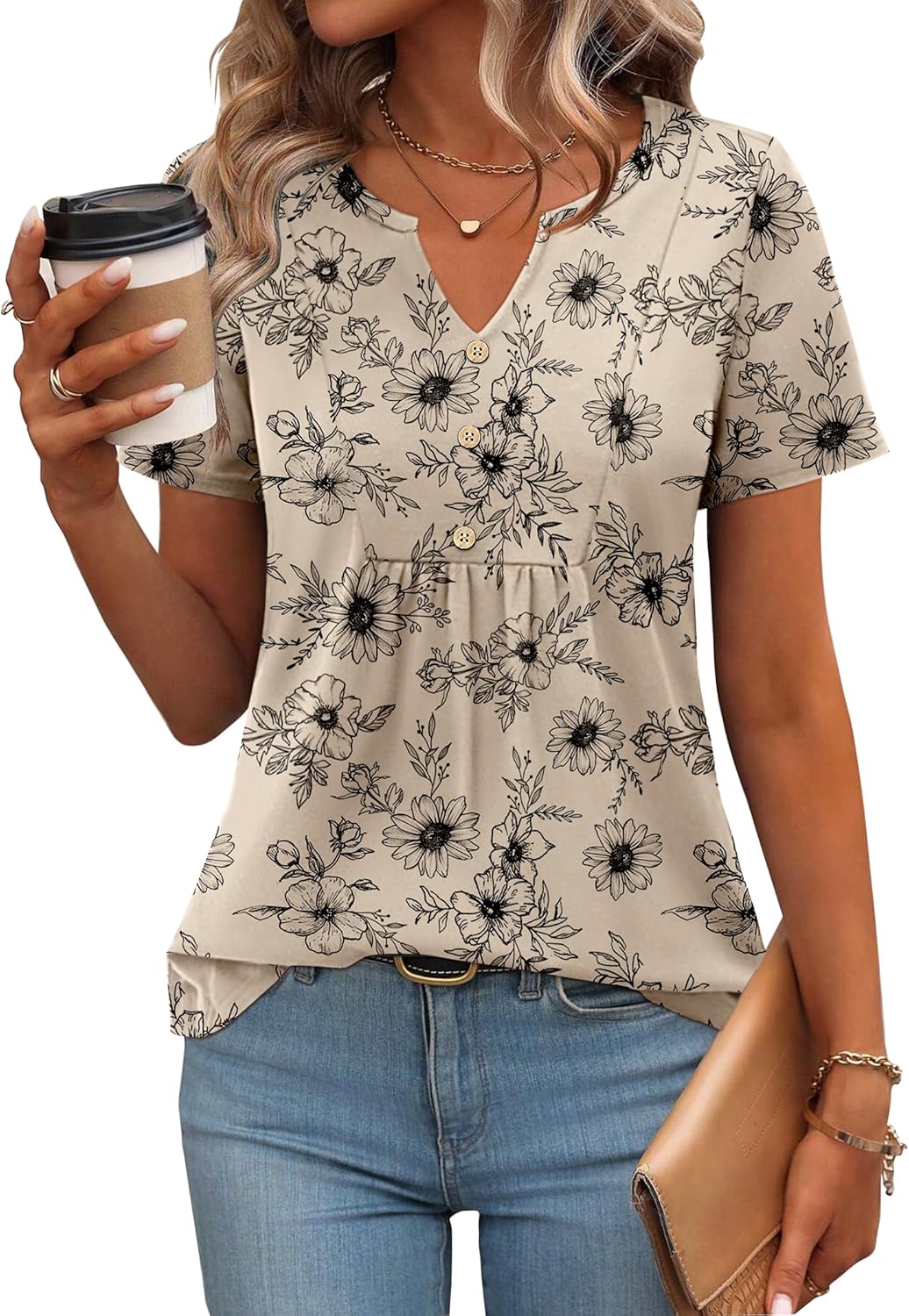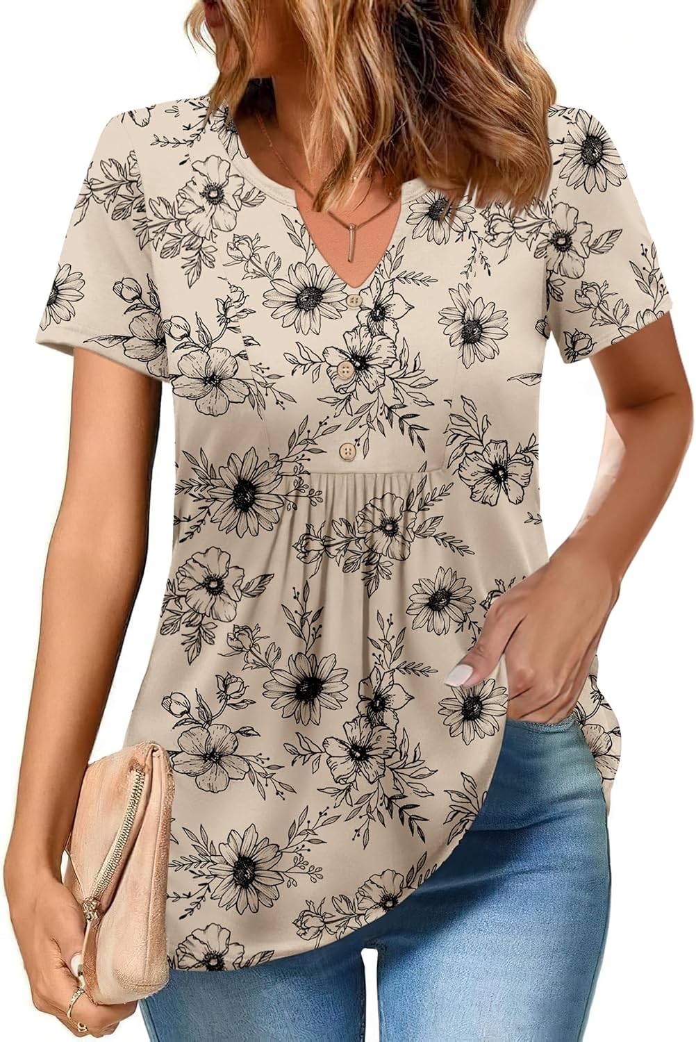 Zeagoo Womens Short Sleeve Tops Summer Henley V-Neck Tshirts Casual Pleated Blouse Dressy Loose Floral Basic Tee